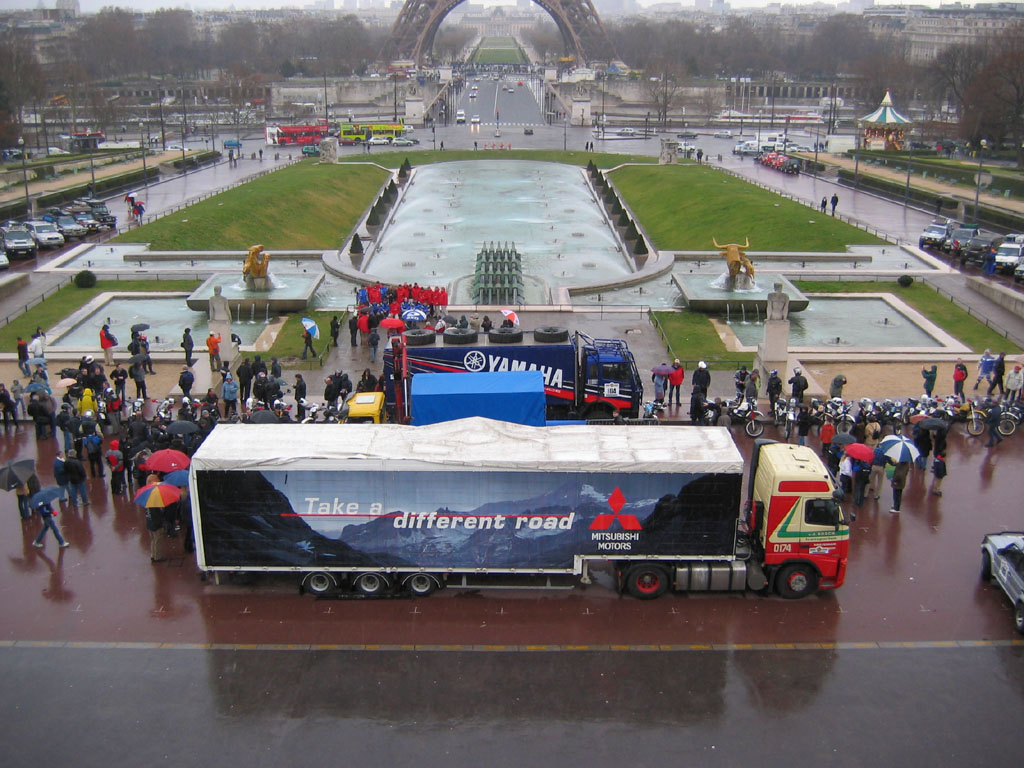 Um 11.30 Uhr macht Auriol, nach einem Fototermin mit allen XTs in Reihe, Fahrerbesprechung von einer Ladefläche aus. Er heißt uns willkommen und freut sich, dass wir alle zu diesem Event gekommen sind. Nach kurzen Instruktionen zum Konvoi Richtung Eiffelturm, geht es um 12.00 Uhr los. Die XTs, und damit Marco, fahren vorweg und die 4x4s hinterher. Eskortiert wird das ganze von drei Polizei-YAMAHAs, die gnadenlos die Straßen sperren. Trotzdem verpasst ein holländischer 4x4 den Anschluß und alle anderen folgen ihm. Lutz und ich im Landy sind auch dabei, aber die Indianer (Team 22) setzen sich nach vorne und führen uns sicher zum Arc de Triomphe und zum Eiffelturm. Es regnet, aber wir sind so aufgeregt, dass es uns nicht stört.