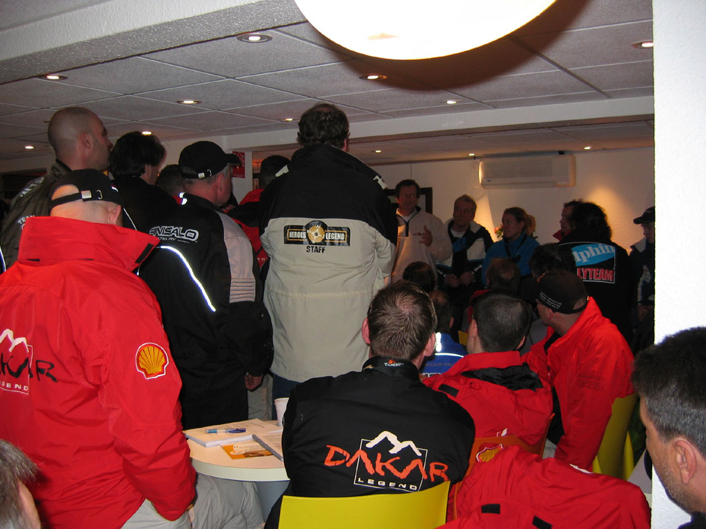 Anscheinend hat es vor unserer Ankunft schon einen Unfall gegeben. Eine Auffahrrampe des LKWs, der als Podium für den Start benutzt werden sollte, ist zwei Heroes Legend Mitarbeitern ins Kreuz geklappt. Sie kommen ins Krankenhaus, müssen aber nicht operiert werden, sie brauchen nur ruhig zu liegen. Außerdem scheint ein 4x4 der Organisation eine Panne zu haben, wird aber sofort durch ein anderes Fahrzeug aus Bordeaux ersetzt. So zumindest erfahren wir es am Abend von Auriol auf der Fahrerbesprechnung.