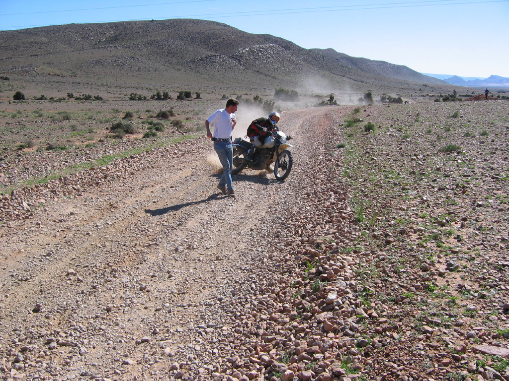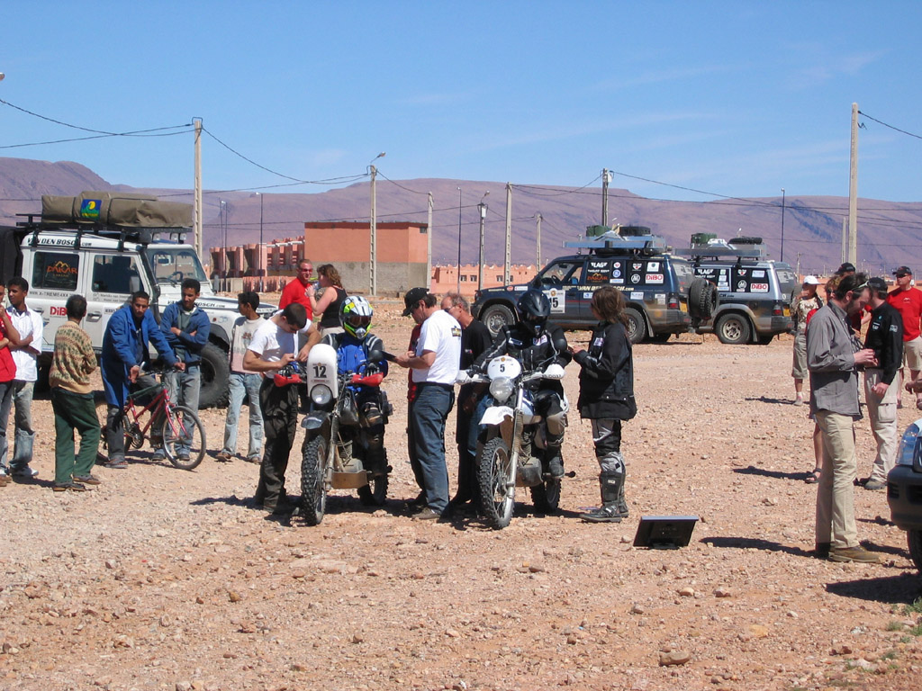 Die SS10 startet in Assa, einer kleinen Stadt südlich von Goulime. Ab 12.20 starten die XTs im Minutentakt. Es müssen 55km zu einem Ort gefahren werden, wofür man 50min Zeit hat. Dort abgekommen gilt es den grünen Button am ItiTrack zu drücken und auf Anne Marie zu warten. Anne Marie geleitet dann alle XTs durch diesen Ort und läßt sie dahinter wieder im Minutentakt starten. Fahrerwechsel, Marco fährt diese SS10. Lutz und ich fahren im Landy in die Stadt, auf der Suche nach Stoßdämpfern. Auf dem Weg kommt uns ein 130er Defender Feuerwehrwagen entgegen. Wir stoppen ihn und fragen nach Teilen für Defender. Man ist sehr hilfbereit und gibt uns einen Feuerwehrmann mit. Zunächst halten wir an einem Autoteileladen, doch es gibt nichts brauchbares. Dann stoppen wir bei einer Werkstatt, bei der drei Serie-Landys vor der Tür stehen. Wir diskutieren, ob auch Serie Stoßdämpfer passen und der Mechniker geht telefonieren. Angeblich soll der Chef kommen. Während wir Tee trinken, kommt ein Junge mit einem Fahrrad und hat zwei alte Dämpfer am Lenker hängen. Wir bedanken uns für die Mühe, bezahlen 7 DH fürs Telefonieren und schenken noch ein paar Kullis. Aber diese Dämpfer kaufen wir nicht. Sie waren auch noch unterschiedlich.