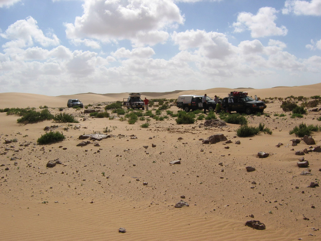 Zunächst fahren wir am Anfang des Konvois, doch schon einige Fotos später sind wir die Letzten. Als dann auch noch der Stoßdämpfer vorne rechts wieder zu klappern anfängt, sind wir allein. Wir lassen Luftdruck an den Rädern ab, als Auriol kommt, der die Strecke hinter uns schließen möchte. Also müssen wir uns beeilen. Aber schon wenige km später steht der Jeep in den Dünen mit einem Platten. Das ist gut, denn so gewinnen wir Zeit. Zusammen mit Team1 und dem Hummer suchen wir den Weg durch die Dünen, den wir aber irgendwie nicht finden können. Wir entschließen uns nach Westen zum Strand durchzuschlagen. Nach kurzer Zeit bleibt der Hummer zurück. Team1 und wir sind allein. Dass es 20km bis zum Meer sind konnten wir nicht ahnen. Wir hatten kein Roadbook und konnten auch mit den Waypoints nicht viel anfangen. Aber wo ein Wille ist, ist ein Weg und so erreichen wir nach Stunden den Strand. Hier kann man schön schnell fahren und auch zwei ORG 4x4s überholen uns. Vorbei an zwei tollen Wracks ballern wir den Strand entlang. Nach 30km kommen Felsen und wir müssen vom Strand runter. Gar nicht so einfach und schon steckt der PickUp von Team1 fest. Wir ziehen ihn zurück und schaffen es selbst nur knappt. Der Pickup schafft es mit schieben. Jetzt stößt der Landy Team7 auch noch zu uns. Außerdem der französische XT Fahrer Nr.2. Er hat sich auch total in den Dünen verfranzt und ist fertig. Später fährt er mit dem Doktor zum Ziel. Wir mittlerweile drei 4x4s schlagen uns nach Süden durch. Immer mal wieder geht es auf den Strand und zurück nach oben. Nocheinmal zieht der 7er Landy den 1er PickUp aus dem Sand. Glücklich erreichen wir einen kleinen Ort, von dem eine Piste zum Teer geht. Wir rufen Anne Marie an, dass wir ins Camp fahren und nicht zum Ziel ASS12.