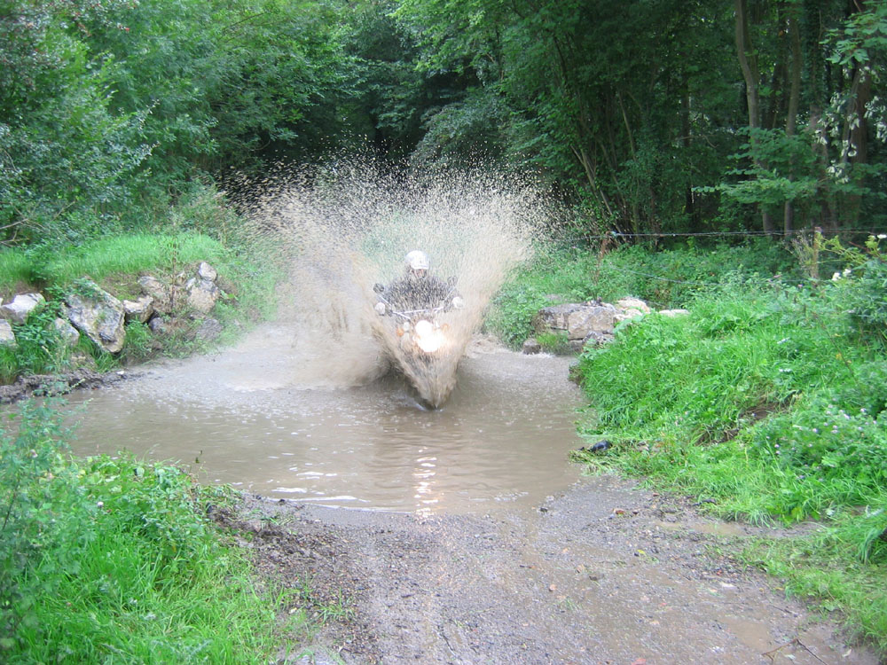 Von der Meute angefeuert fährt man dann auch mal zu schnell durch eine Furt!