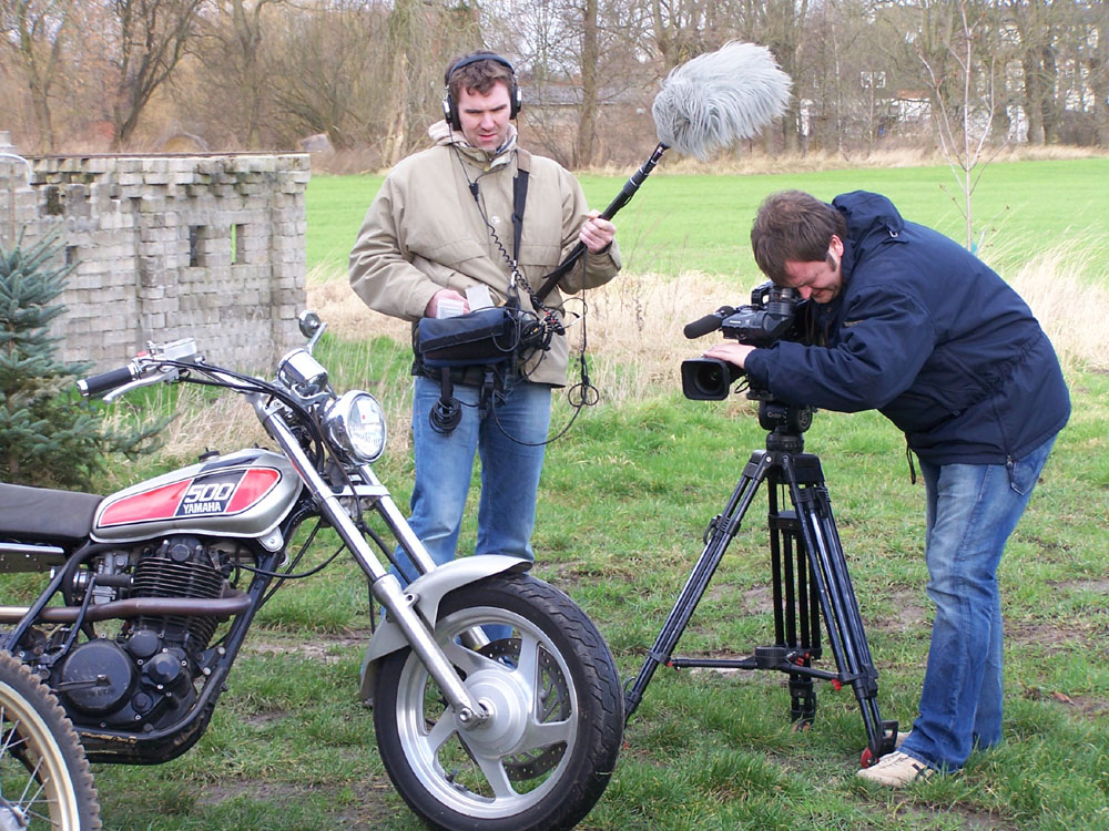 Um 10:00 Uhr waren sie da und begannen mit diversen Schwenks durch meine Garage. Wir wählten drei XTs aus und schoben sie nach draußen, wo weitere Aufnahmen gemacht wurden. Es war unglaublich wie lange sich das hinzog. Das Wetter war an beiden Tagen der absolute Hammer, wenn man an die Stürme der letzten Nächte und die Sturmflutwarnung denkt. Erst um 15:00 Uhr war alles abgedreht, was Thorsten für seine Reportage benötigt. Nun fliegt er mit den Bändern zurück nach Baden-Baden, sichtet das Material und läßt einen Cutter den Bericht schneiden. Danach folgt noch die Syncronisation durch einen OFF-Sprecher und fertig ist die Laube.