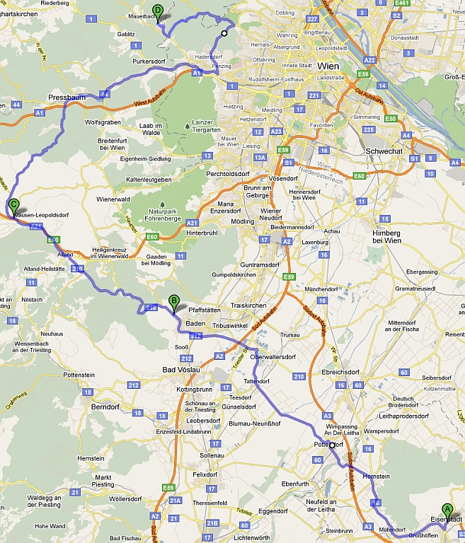 Von Eisenstadt aus z.B. würde die Route nach Mauerbach (mit ca. 105km und zweieinviertel Std.) also ungefähr so aussehen: