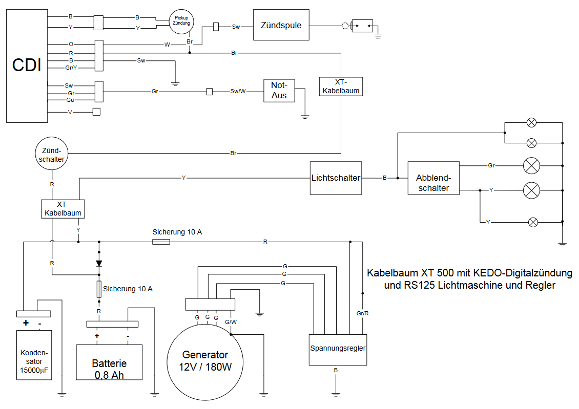 ich habe nur einen vereinfachten Schaltplan für eine andere XT von mir, aber die Diode habe ich dort auch drin...wobei Sie hier aufgrund der stärkeren Lima wahrscheinlich nicht notwendig wäre. Da die Batterie hier die Zündung versorgt und die Batterie nur 0,8 Ah hat, wollte ich ein Entladen der Batterie verhindern (Erfahrung aus der Anfangszeit mit 12V und H4 ...