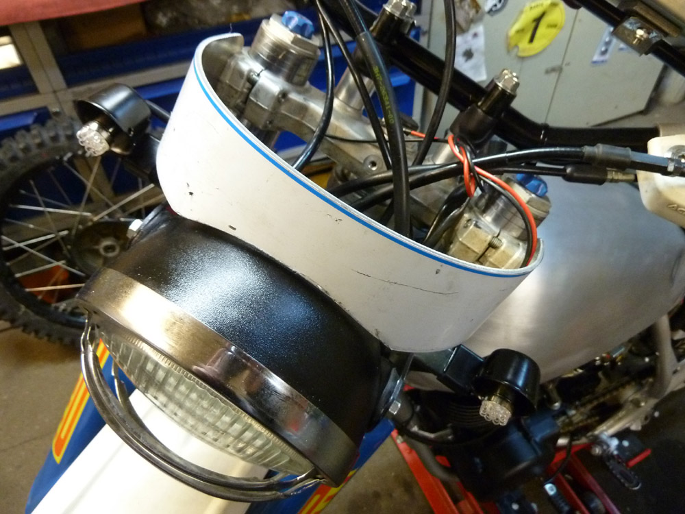 Das montiere ich zuerst an der Gabel und passe es am Scheinwerfer an.
