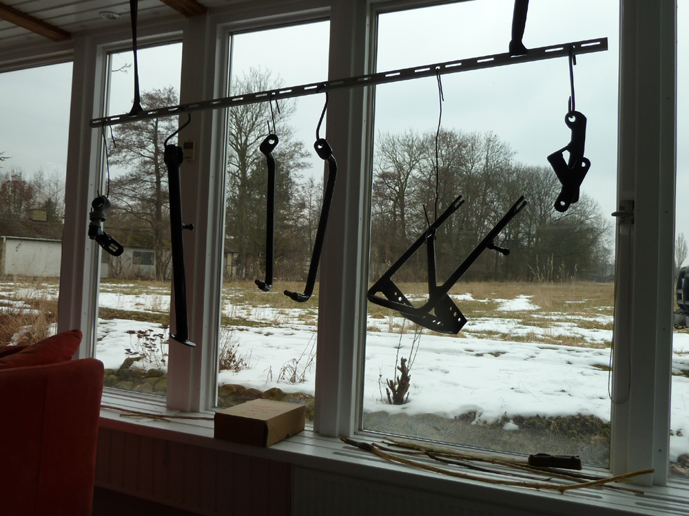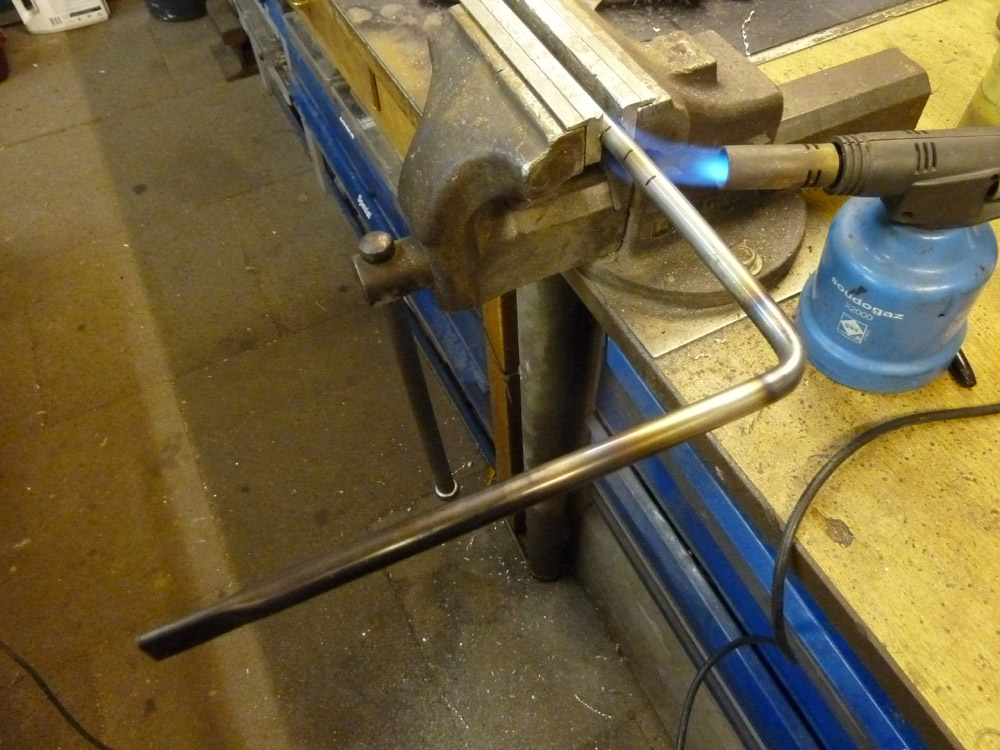 Die Halterung baue ich aus 12mm Rohr. Die Enden stecke ich in den Ofen, der ja eh durchgehend brennt, und klopfe sie rotglühend platt. Geht sicherlich auch kalt, aber nun komme ich mir auch noch wie ein Schmid vor