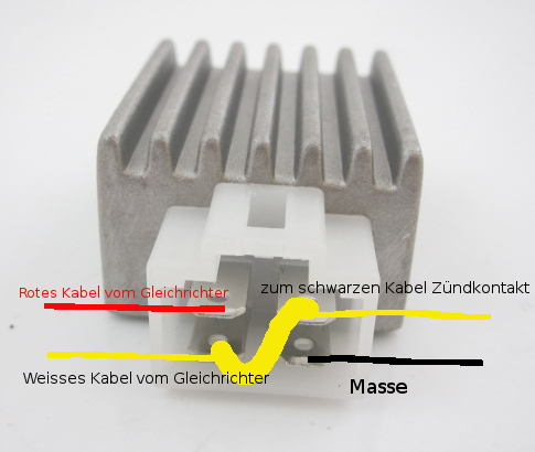 zum schwarzen Kabel vom Zündkontakt, sondern zum Gelb/Weissen Kabel, dass man normalerweise beim Röbi-Regler einfach nirgends anschliesst und hängen lässt oder beim Original-Regler anschliessen würde !