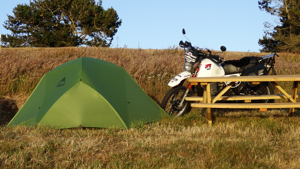 Auf dem nun wieder breiteren Highway 1 geht es über Fort Bragg, Point Arena weiter Richtung Süden. Die Küste ist auch hier nördlich von San Francisco nach wie vor sehr von Klippen und verwitterten Felsen geprägt. Nach 520 km auf dem 101er sowie 1er erreichen wir gegen 19.00 Uhr Bodega Bay. Alles ist voller Touristen, die Campgrounds belegt. Auf einer Pferderanch kriegen wir aber einen dem Seewind stark ausgesetzten Platz zugewiesen, wo wir in Schräglage unsere Zelte aufschlagen können. Noch ist das Wetter bestens und warum sollen unsere Zelte nicht auch beweisen, dass sie so sturmfest wie die XT500 sind. Es wird ja wohl kaum noch schlimmer stürmen kommen…