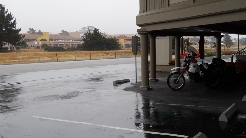Nun ja – eigentlich kennen wir das ja aus Alaska. Aber hier unten in einer der schönsten Gegenden der Welt stört es halt doch. Wen verwundert es, dass unsere Fahrt zuerst durch Regenwälder füht, bevor wir uns nach etwa 50 km im etwas trockeneren Stinson Beach ein ausgiebiges amerikanisches Breakfast genehmigen. Danach ist San Francisco rasch erreicht. Aber der Nebel ist hier so dicht, dass man eigentlich einen Scheibenwischer für’s Helmvisier bräuchte. Man sieht kaum noch was. Von Norden her kommend, fährt nun Axel mit Navi ausgerüstet im Mietwagen voraus. Im mittlerweile sehr stark aufkommenden Verkehr hilft dies. Wir stoppen auf dem Parkplatz vor dem Nordende der Golden Gate Bridge. An ein Foto ist aber nicht zu denken. Es ist mehr Wasser in der Luft, als wenn es regnen täte. So montiere ich einfacherweise die GoPro und mache mich im dicksten Nebel auf, hinter Axel herfahrend, die Golden Gate Bridge per XT500 zu überqueren. Die GoPro hat eine stark gekrümmte Linse, an welcher das Wasser besser abperlt, als am Helmvisier. So entsteht ein nasses XT500 Video, welches auf YouTube garantiert seinesgleichen sucht.
