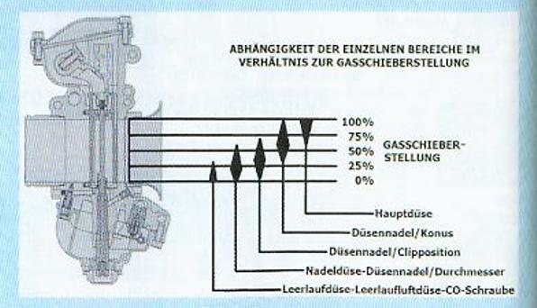 Die Kedoner meinen damit, dass die Gesamtabstimmung HD-abwärts stattfinden sollte, weil da weniger Wechselwirkungen nach Veränderung stattfinden. Die HD hat mit dem Leerlauf normalerweise garnichts zu tun - außer Deine Düsennadel ist abgebrochen... Die HD selbst wirkt sich somit auch nicht auf den Standgasbereich aus. Hier das Bild von Kedo, was wofür zuständig ist. Ist denn die Peripherie serienmässig oder wurde arg rumgebastelt? Luftfilter, Auspuffanlage, Ansaugwege usw...Kann schwankendes Standgas auch von der grösseren HD kommen?