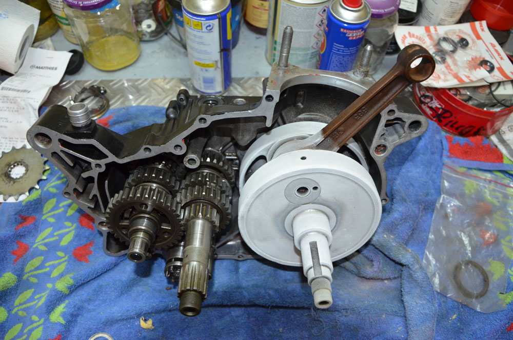 Das Thema gelb/grün ist leider noch nicht geklärt. Ich hab derweil mit dem Getriebe angefangen. Teile sortiert und die Lager bzw.Kurbelwelle wieder eigepresst.