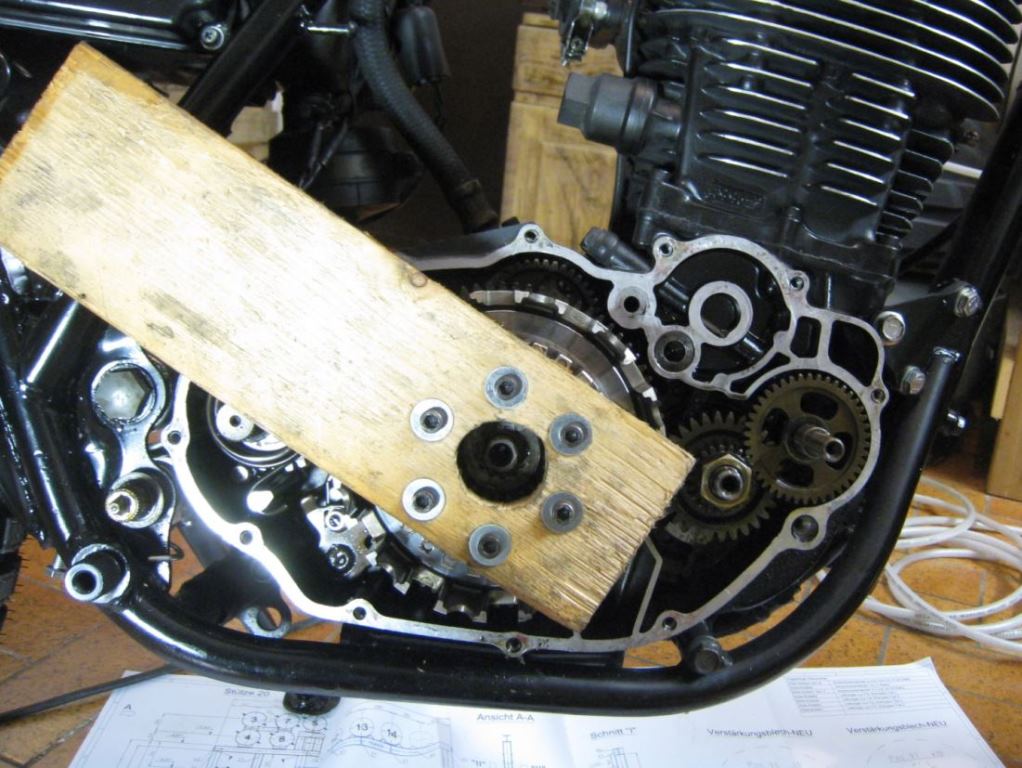 Achtung! Nicht das Brett wie im Bucheli beschrieben über die Stifte vom Kupplungskorb stecken. Die brechen ab!. Ein Seil um den Korb geschlungen und damit gegenhalten ist eine andere Möglichkeit.