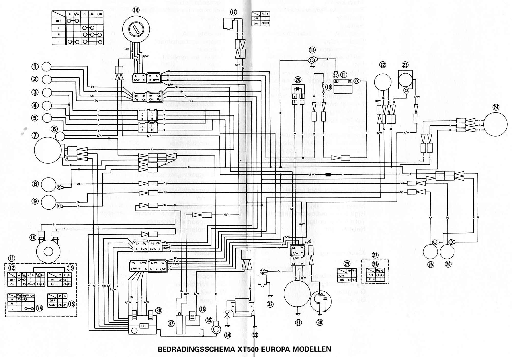 Dieser Schwarz-Weiß-Schaltplan findet sich übrigens genauso schon im Werkstatt-Handbuch für die XT500(C) von 1976 und galt für einige Länder in Europa, außer für Deutschland(?). Für Deutschland und ein paar andere Regionen weltweit ist ein abgewandelter Plan enthalten, mit vierpoligem Zündschloss, welches nur zwei Schaltstellungen zulässt!?