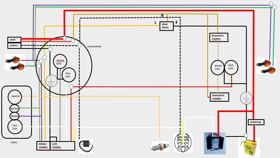 So ich bin jetzt fertig mit meiner kompletten Neuverkabelung, denn das war es letztendlich, obwohl das vorher so schlecht gar nicht aussah. Ich habe versucht das vereinfacht zu dokumentieren, weil Leute wie mich so ein richtiger gezeichneter Schaltplan eher abschreckt, weil zu komplex. Ich habe jetzt den Röbi Regler integriert und evtl. ist es auchfür andere Elektrik Laien so etwas einfacher zu verstehen. Die Kabelfarben sind so wie sie bei mir sind und haben letztendlich nicht mehr viel mit dem Original zu tun. Es scheint alles zu funktionieren, allerdings mein elektronischer Koso Tacho scheint die Elektrik nicht so zu mögen. Das Neutral Licht Geht schon ohne laufenden Motor immer aus und an . Verstehe ich nicht, ist ja letztendlich nur Zündungsplus über den Neutralschalter auf Masse gelegt. Wenn der Motor läuft scheint das Neutral stabil zu leuchten, aber Fernlicht Anzeige geht immer aus und an. Die Lichter selbst Fernlicht, Bremslicht, Blinker etc. funktionieren. Jemand ne Idee?