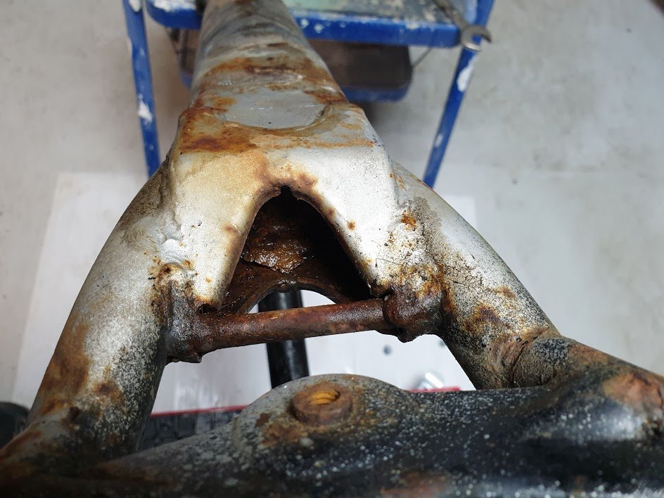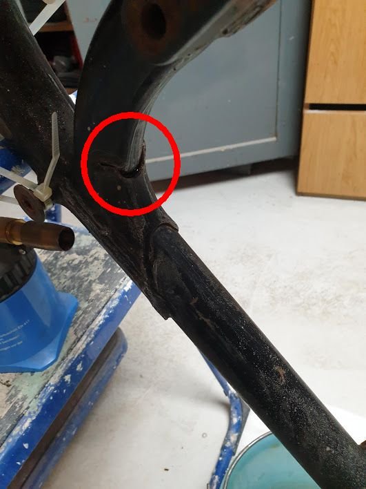 Heute gab es allerdings eine böse Überraschung. Der Rahmen ist zwar äußerlich schon angerostet, macht aber eigentlich einen sehr soliden Eindruck. Ich wollte heute dann den Öltank mit Tankentroster behandeln. Öffnungen abgedichtet, gefüllt bis an den Rand und gewundert warum es plötzlich eine Pfütze auf dem Boden gab. Zwei undichte Stellen, einmal oben am Rohr und unten am Bogen (siehe Bilder) Bin ehrlich gesagt unschlüssig was ich machen soll. Das kann man sicher gut schweissen (ich leider nicht), aber ist dann in ein paar Monaten eine andere Stelle dran und das ganze Öl liegt auf dem Boden? Muss mal mit dem Endoskop rein, aber ob ich da wirklich etwas sehe? ich befürchte der gehört aufs Altmetall, obwohl zum Beispiel die Fussrastenaufnahmen echt noch gut wären.