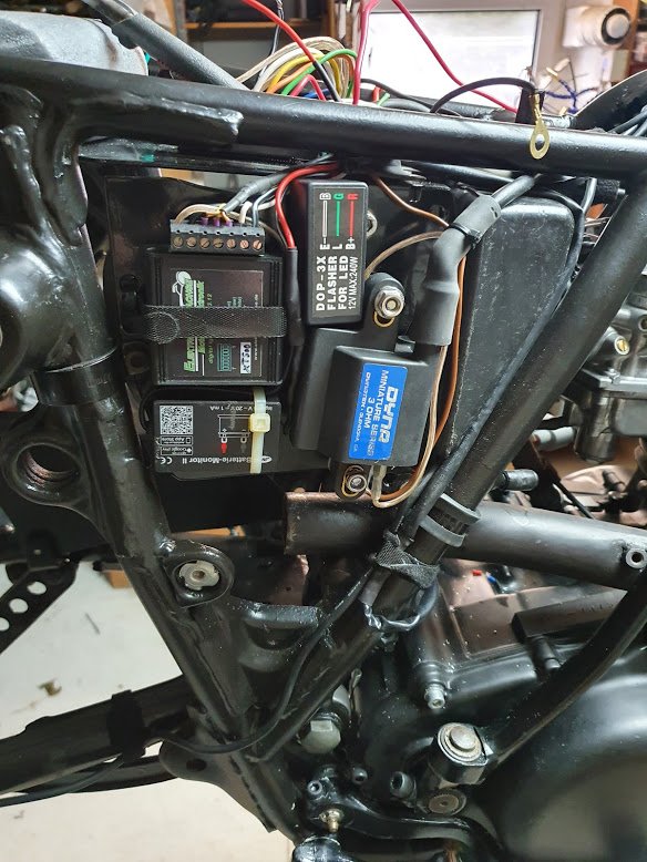 Momentan (mit offenem K&N habe ich die Elektrik Komponenten auf einer Alu Platte rechts s. Bild) und links muss noch die Batterie (130x80x80) und der Regler Platz haben.