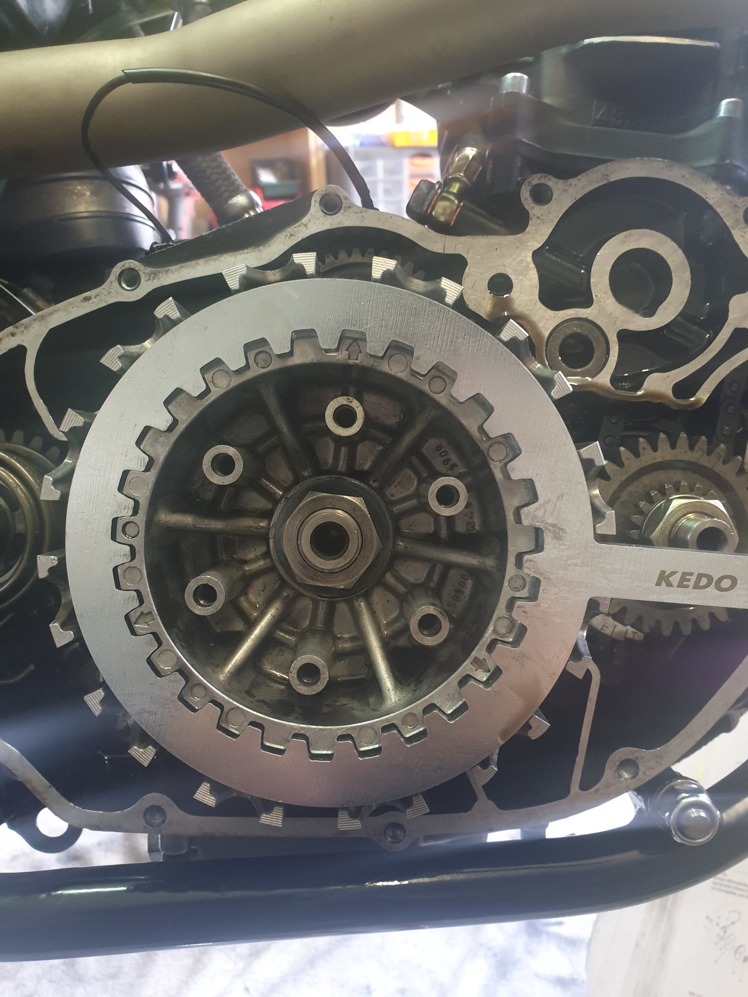 Was mir persönlich aufgefallen ist und mir etwas komisch vorkam ist das wenn ich den Kupplungskorbhalter von Kedo zum anziehen verwende und die Mutter anziehe fluchtet alles. Will ich die Kupplung dann wieder ausbauen kann ich den Kupplungskorbhalter nicht mehr richtig einsetzten wie als ob sich etwas leicht verschiebt. Erkennt man hoffentlich auf dem Bild.