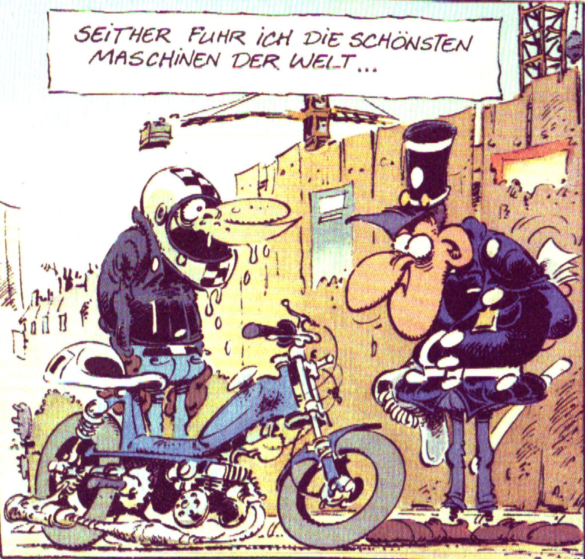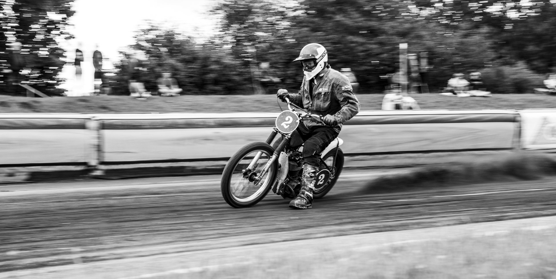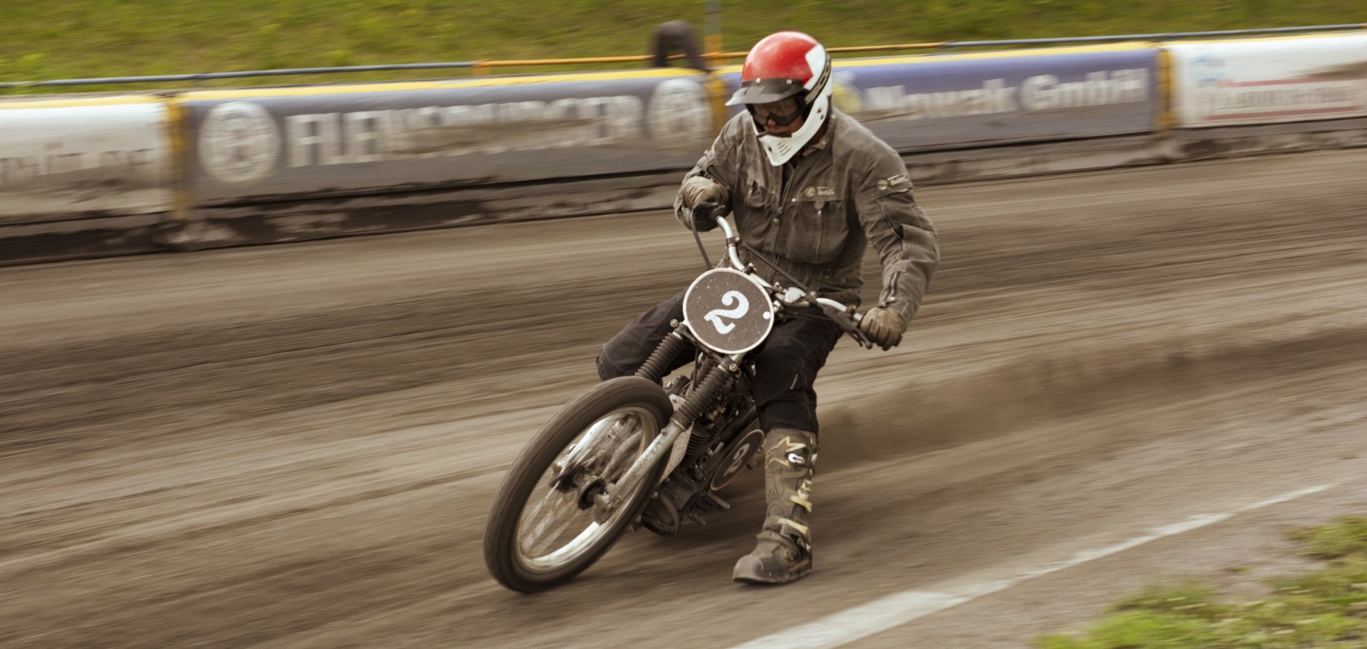 Da ich mit dem Speedwayrahmen und tiefer Fußraste, im Gegensatz zu den Flat Trackern, die Kurve im einbeinigen Stand stehend fahre ist das auf Dauer aber auch ziemlich anstrengend und gibt als untrainierter Endfuffziger Hobbyhonk spätestens am nächsten Tag einen ordentlichen Muskelkater (also nicht irgendeinen Muskelkater sondern so'n richtigen Männermuskelkater, ihr versteht...