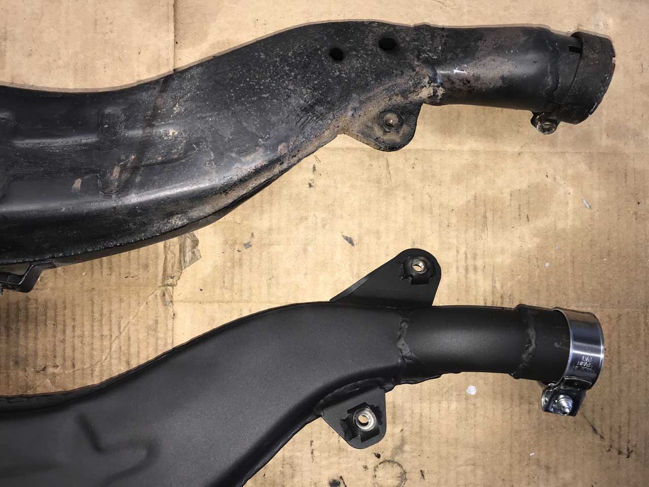 Bislang macht die zusätzliche (also wie original) Halterung am TT-Exemplar was sie soll und es sind noch keine Risse sichtbar. Peppmöller rät mittlerweile davon an, den XT - Dämpfer ohne Flammbox und ohne weitere Halterung zu verbauen.