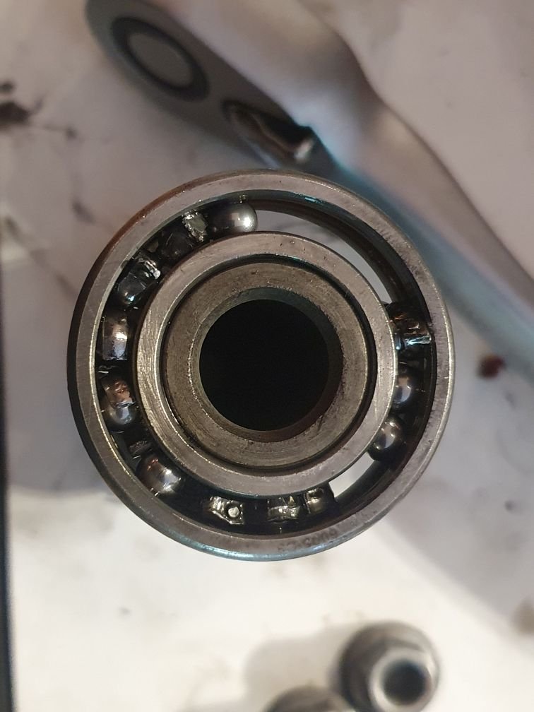 Ein Teil des Käfigs liegt oben neben der Feder rum, ob sonst noch was im Motor unterwegs ist weiss ich nicht. Wie passiert sowas? Das Lager war neu eingebaut. Stellt sich ja schon die Frage, ob es sinnvoll ist ein gut laufendes Lager durch ein neues zu ersetzen, welches dann sowas macht...