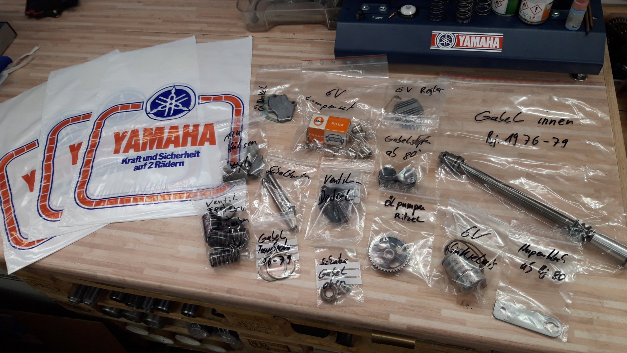 Um das ganze etwas interessanter zu machen, habe ich aus meinem Fundus paar XT Teile als Preise zusammengestellt, ist alles kein Goldstaub aber vieleicht kann der ein oder andere davon was gebrauchen. Also pro gewonnenes Rätsel bekommt man einen Punkt ..ABER jeder hat nur 3 Versuche!!!...Am Ende gibt es für die ersten drei Plätze Preise...der 1.Platz darf sich 3 Tütchen, 2.Platz 2Tütchen und der 3.Platz ein Tütchen aussuchen, zusätzlich bekommt jeder der ersten drei eine originale NEUE Yamaha Plastiktüte aus den 70er/80er Jahre...absolute Rarität