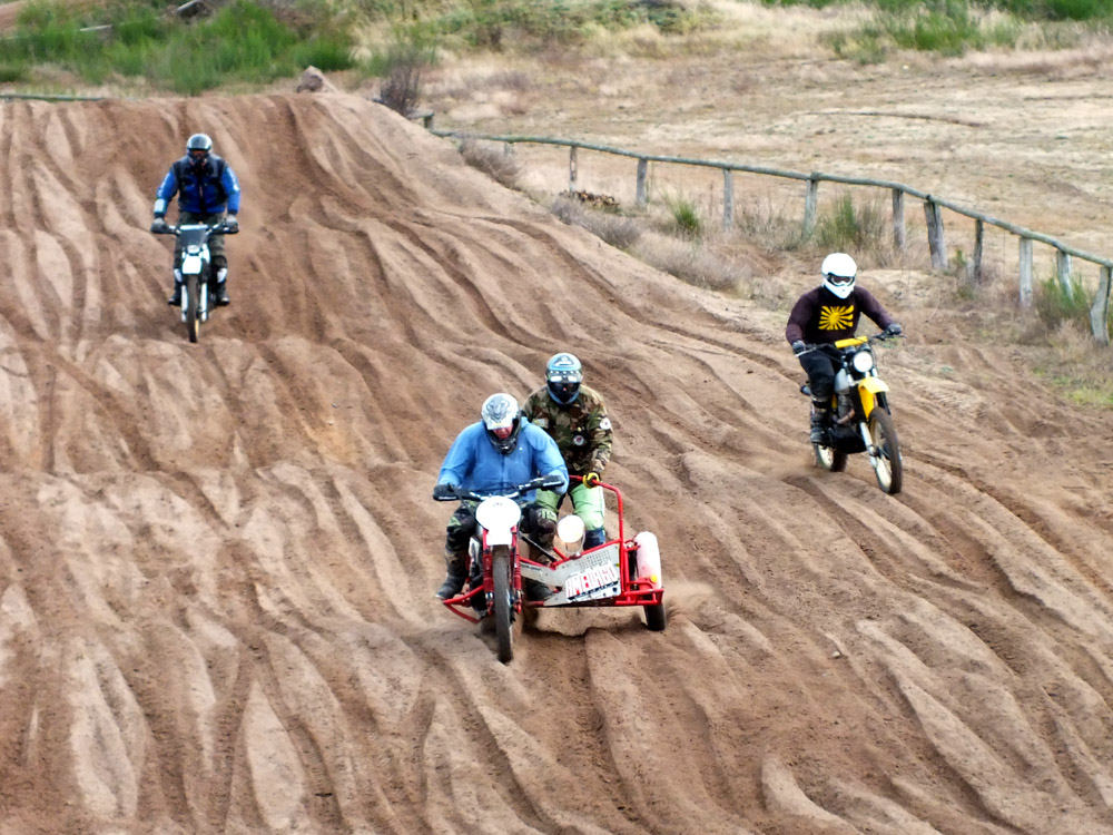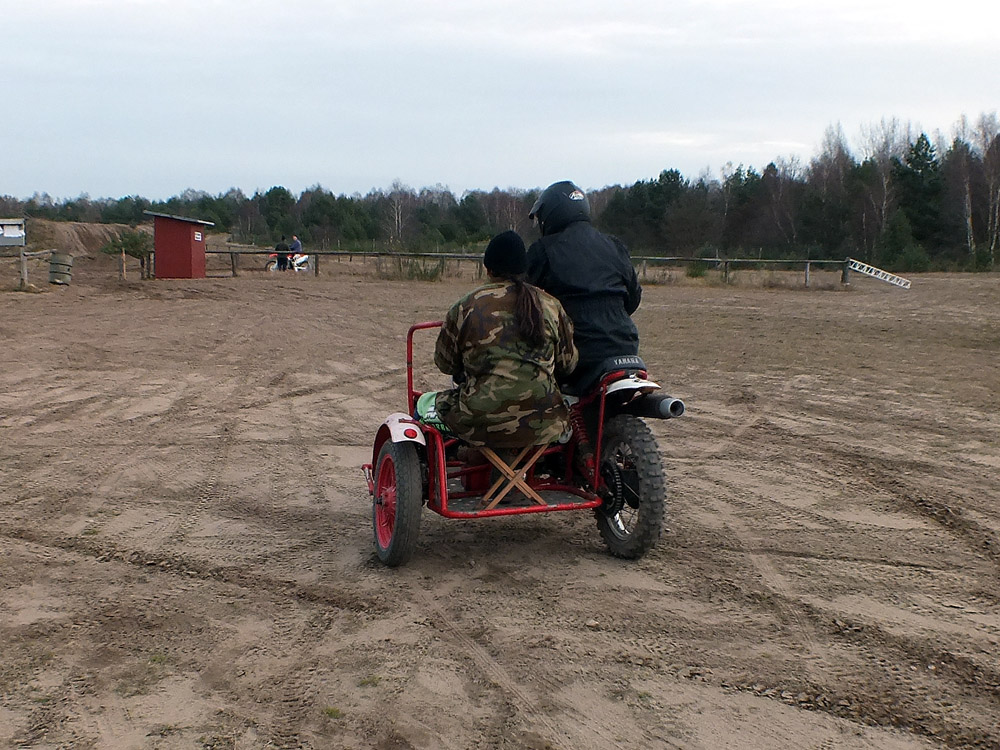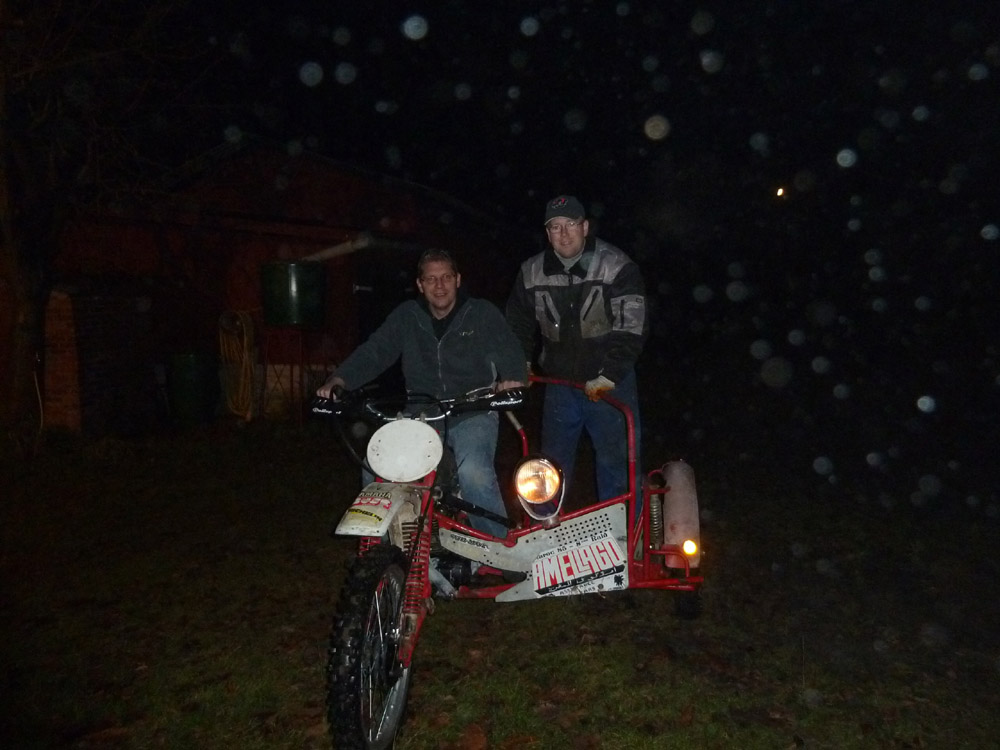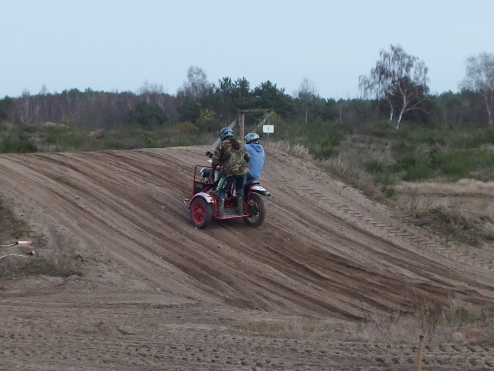 ... Ulrich war auch beim Adventscrossen und hat uns Tipps gegeben, wie man ein Gefühl für das Gespann bekommt. Rammel hat es gleich sehr schön umgesetzt und ist eine Acht nach der anderen mit dem Beiwagenrad in der Luft gefahren. Später dann auch mit Claus in der Luft