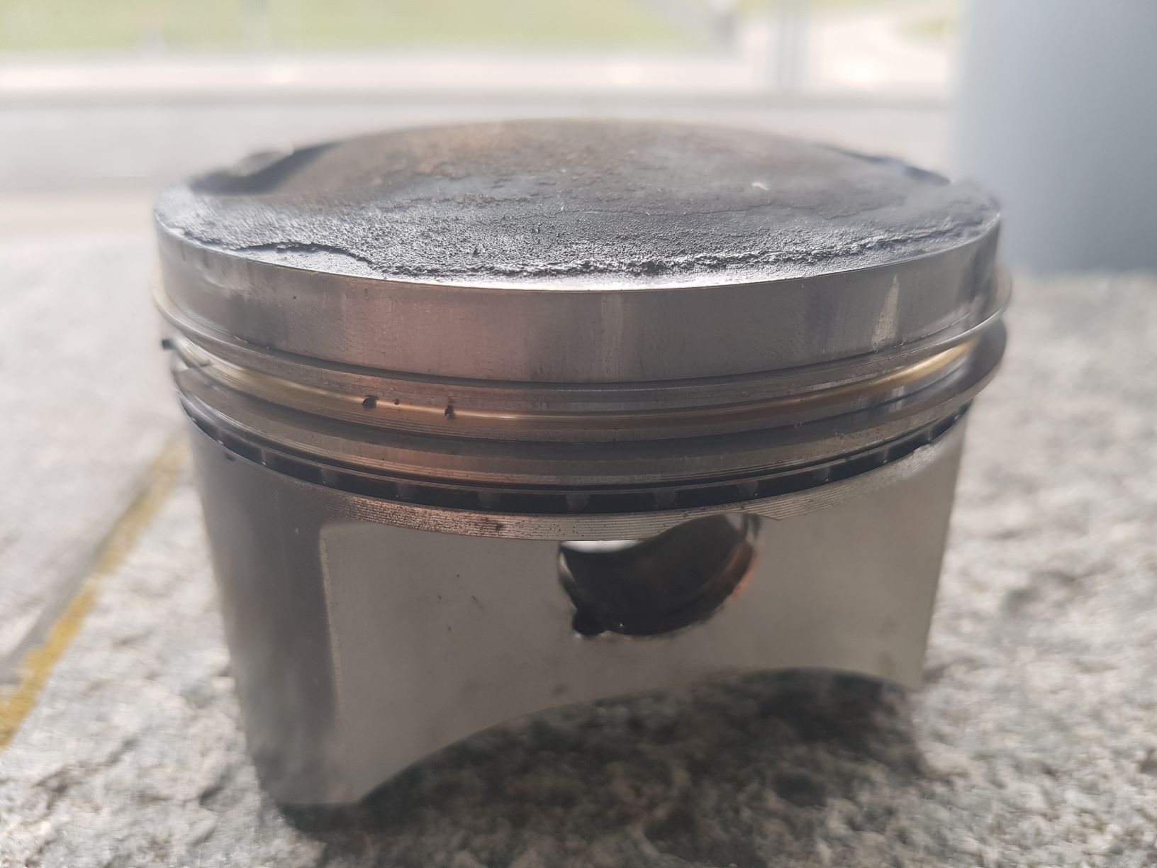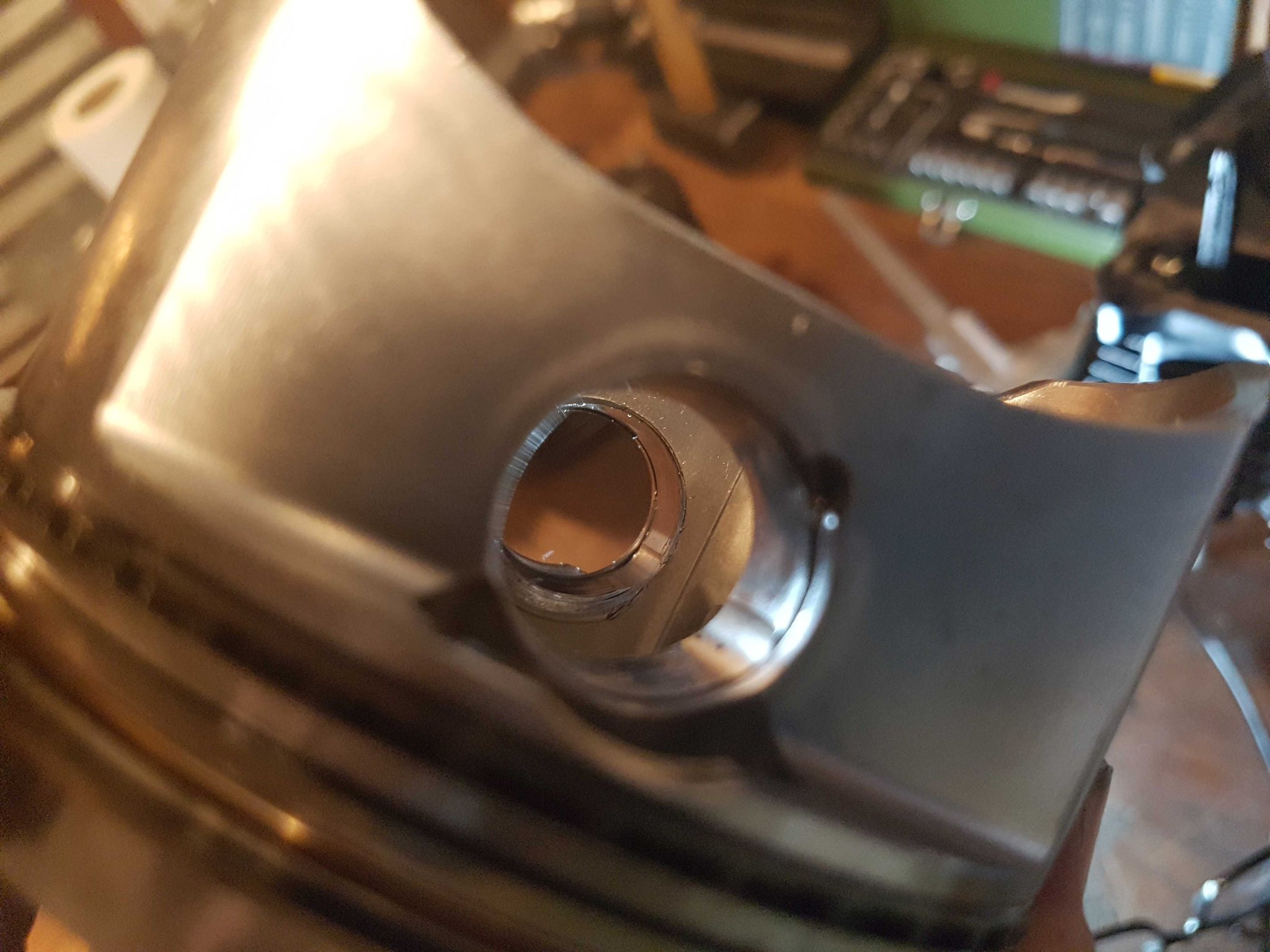 Nachdem der Zylinder runter war gabs dann was zu sehen: Der Kobenbolzen war auf der einen Seite rausgewandert bis auf Höhe Kolbenwand!? Bilder unten anbei. Der Bolzen lief nur noch auf einer Seite in der Kolbenbohrung und hatte denmnach satt Spiel. Ich würde sagen er kann gut einen mm gedreht werden, so dass damit der versetzte Einschlag des Ventils oben im Kolben vermutlich erklärt werden kann.