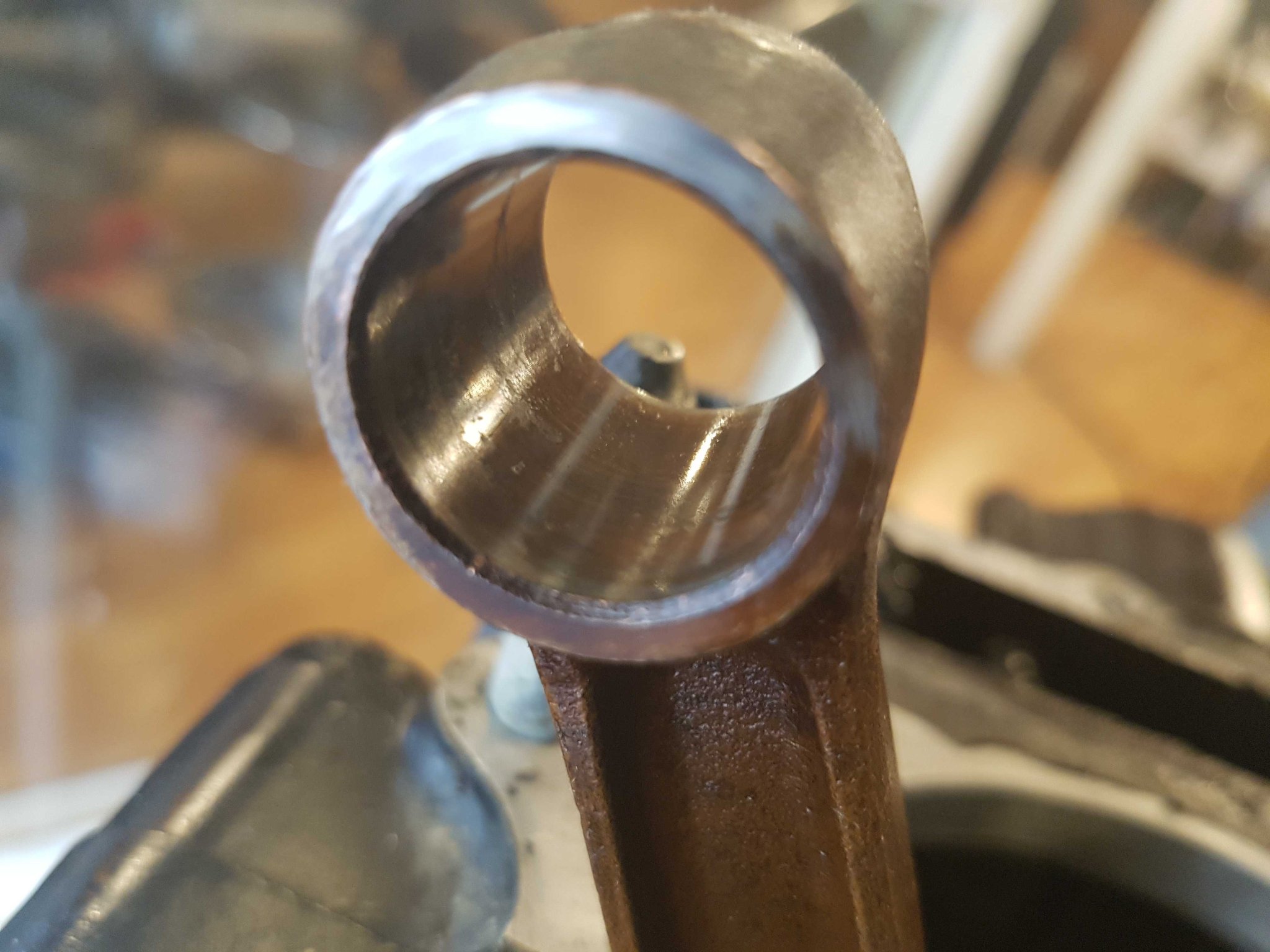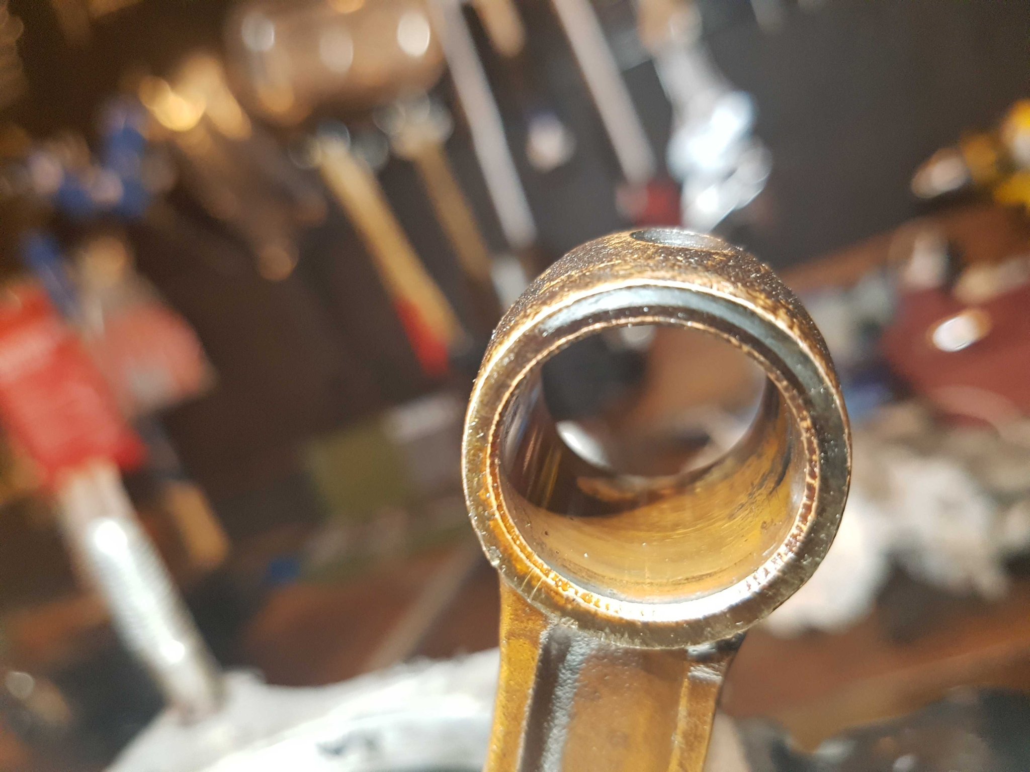 Ich kann mir nicht vorstellen, das das Pleuellager so eine Belastung schadlos übersteht, kann das aber nicht gut beurteilen. Die Lagerbuchse hat noch eine Kupferoberfläche, die sieht aber nicht gut aus. Wenn man den Bolzen reinsteckt hat der fühlbar Spiel. Der sieht allerdings erst recht übel aus. Wenn man die Bolzenaufnahme des Kolbens im Licht betrachtet sieht man sogar wie der Bolzen dort Einbuchtungen in der Bohrung eingearbeitet hat.