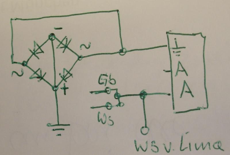 Den Brückengleichrichter, den man zwischen Motorrad- und Reglermasseanschluss hängt, wird folgendermaßen beschaltet, und hat dann die Funktion von jweiels zwei parallel geschalteten, antiparallelen Dioden. Sie bewirken einen Spannungshub, weswegen man keine Schottkydioden nehmen sollte, die haben nämlich eine sehr geringe Vorwärtsspannung. Ist der Spannungshub zu niedrig, und die Fahrlichtbirne kriegt zu wenig Spannung (unter 13V) kann man den Gleichrichter auch anders verschalten, dann hat er den doppelten Spannungshub.