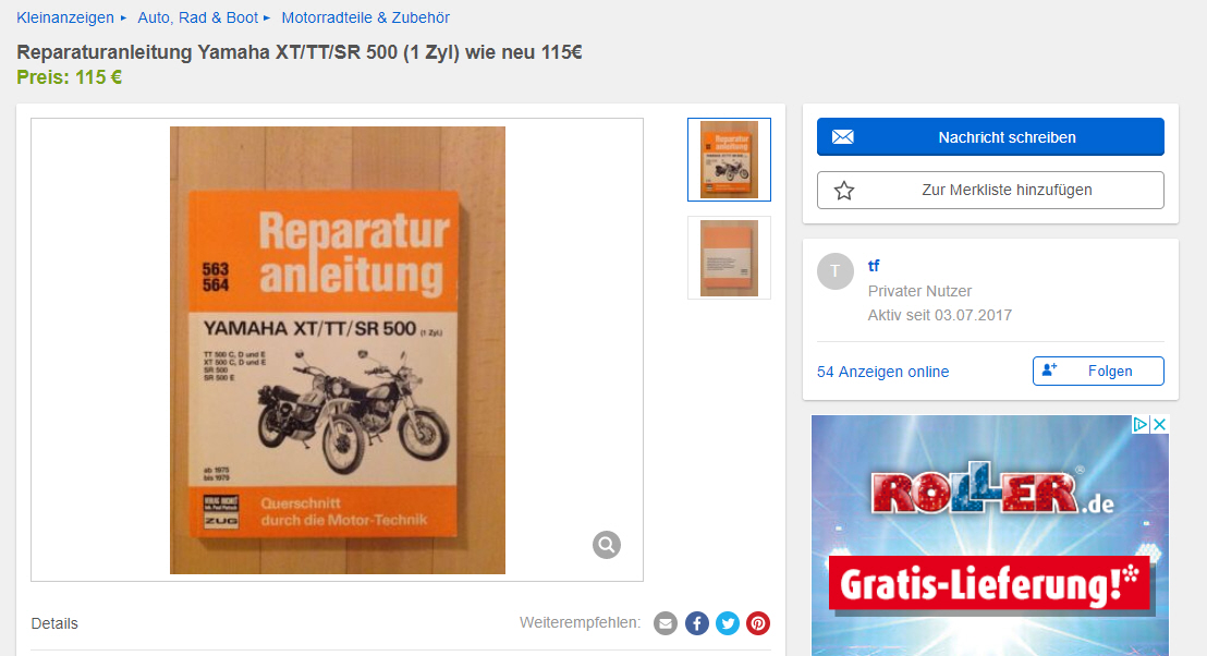 Mal wieder so ein Fall. Der Anbieter verkauft lauter Motorräder über ihBäh Kleinunzeigen, aber hat angeblich Probleme mit der Seite und ruft echt komische Preise auf.
