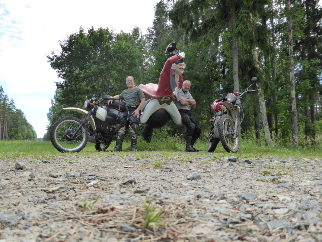 Dann wieder raus aus der Stadt, was schwierig war, denn die Beschilderung ließ etwas zu wünschen übrig. Schließlich erreichten wir die "Autobahn" A1 Richtung Norden (die eher sowas ist wie eine vierspurige Bundesstraße). Erstmal wollten wir ein wenig Fahrtwind, um den drohenden Hitzekollaps abzuwenden und nebenbei ein paar Meter machen. Es ging prima voran, bis wir in Dunte, etwa 60 km nördlich von Riga, den Baron von Münchhausen entdeckten.