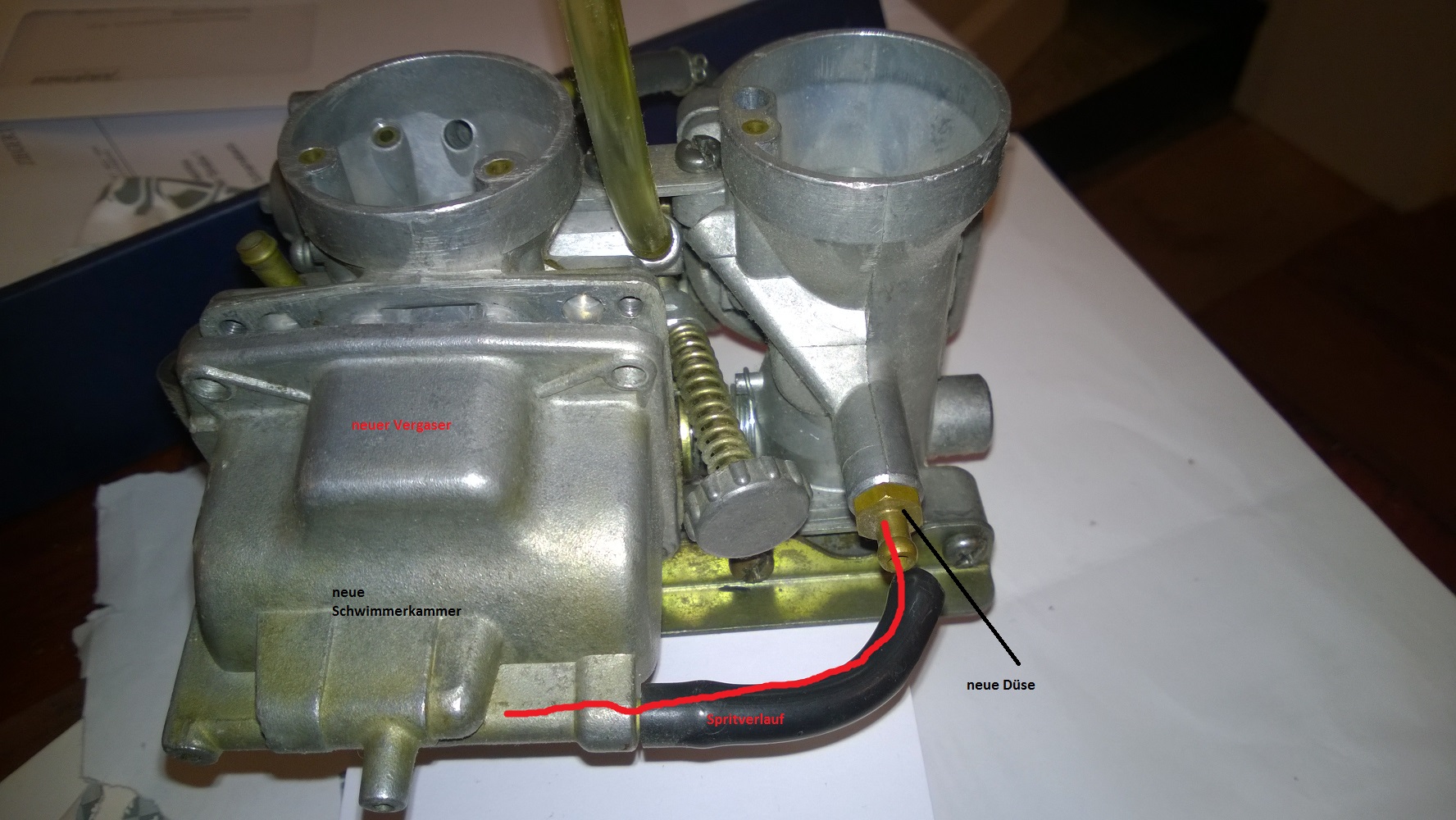 Das lag daran dass man sich ein Schwimmersystem sparen wollte. So wurde die Hauptdüse des rechten Vergasers mit in den Schwimmerkammerraum des linken Vergasers integriert.