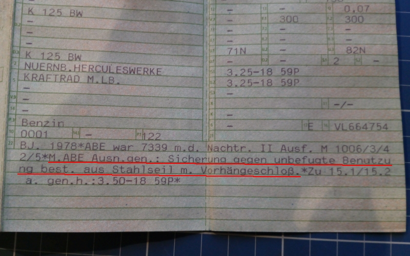 Da ist das in den Papieren z.B. so eingetragen: (ist original so und wird in der Packtasche mitgeführt)
