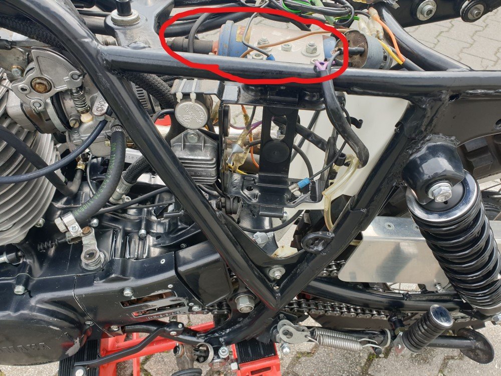 Meine XT war auch auf Batteriezyndung (mit 12 V) umgebaut. Eine ähnliche Spule wie die oben gezeigte passte gerade so unter den Ackerpiss-Plastetank.