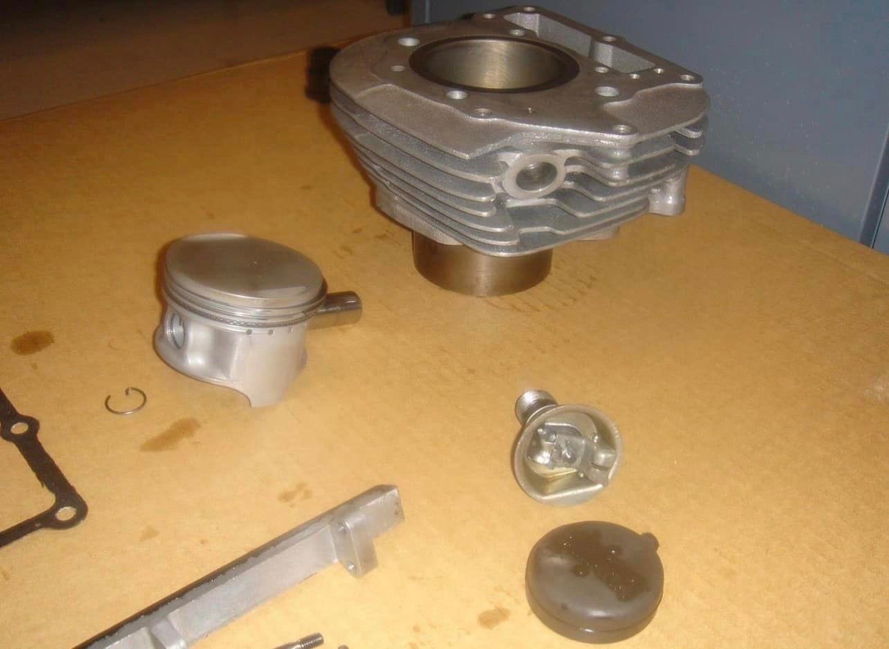 "SC500 decompression assembly in the foreground. 85.5mm bore x 83.25mm stroke for 478cc displacement. Displacement was limited by crankshaft clearance to transmission gears"