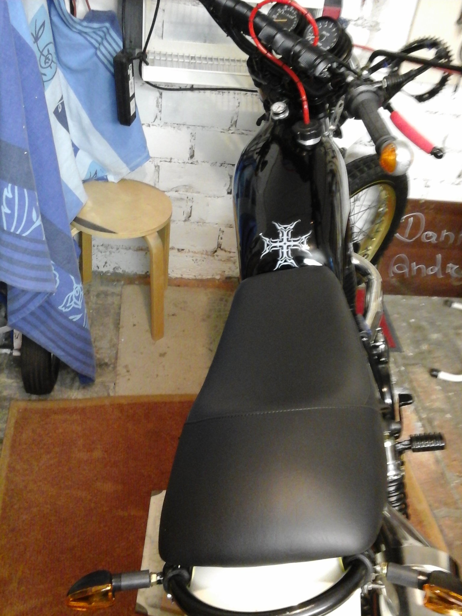Auch eine Variante, zumal der Sattler zwar einen Superjob getan hat aber die Anweisungen nicht ganz verstanden und nun hat der Sattel vorn den schrägeren Winkel der zum Alutank passen würde aber nicht zum Stahltank der drauf ist. Eventuell bring ich den halt nochmal und lass bei dieser Gelegenheit oben gleich etwas wegnehmen.