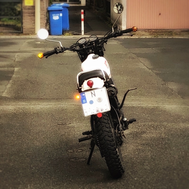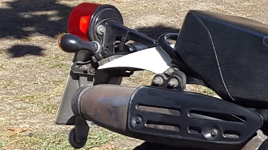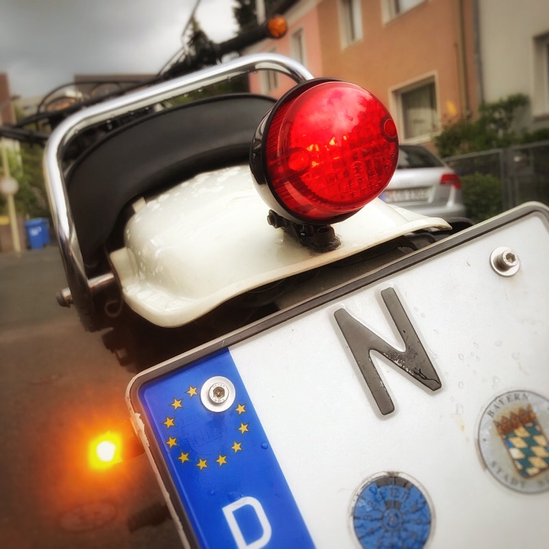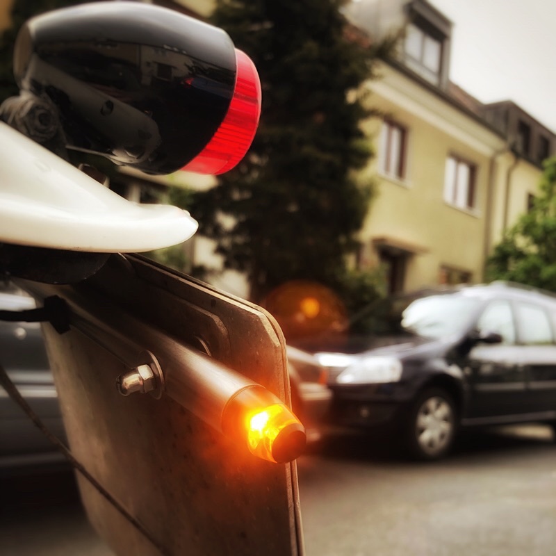 Anfangs hatte ich auch die Blinker am Rücklicht so wie in D üblich. Später hatte ich sie ans Schutzblech moniert und dafür in jugendlichem Leichtsinn Löcher in selbiges gebohrt. Im Zuge meiner Totalrestaurierung habe ich die Löcher zugeschweißt und das Schutzblech neu lackiert.