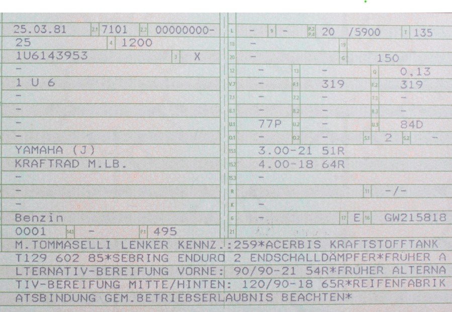 es ist unglaublich welche Eintragungen es gibt, je nachdem wann und wie man etwas hat eintragen lassen. Bei meiner Ur- XT habe ich 1992 die 3.00 - 21 nachtragen lassen. Dabei wurde die Reifenfabrikatsbindung mit Kugelschreiber durchgestrichen, dafür ein Geschwindigkeitsindex hinzugefügt.