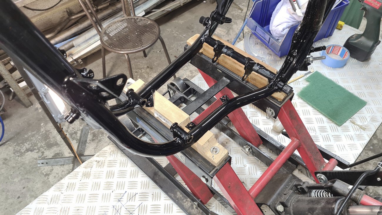 Bei meiner mehrjährigen Totalretaurierung habe ich mir ein Wägelchen gebaut, wo oben drauf das Moped festgeklemmt war und unten Fächer für Kunststoffboxen waren, in den Boxen waren die ganzen abgebauten Teile drin. Denn ein zerlegtes Motorrad brauch bekanntlich viel Platz.