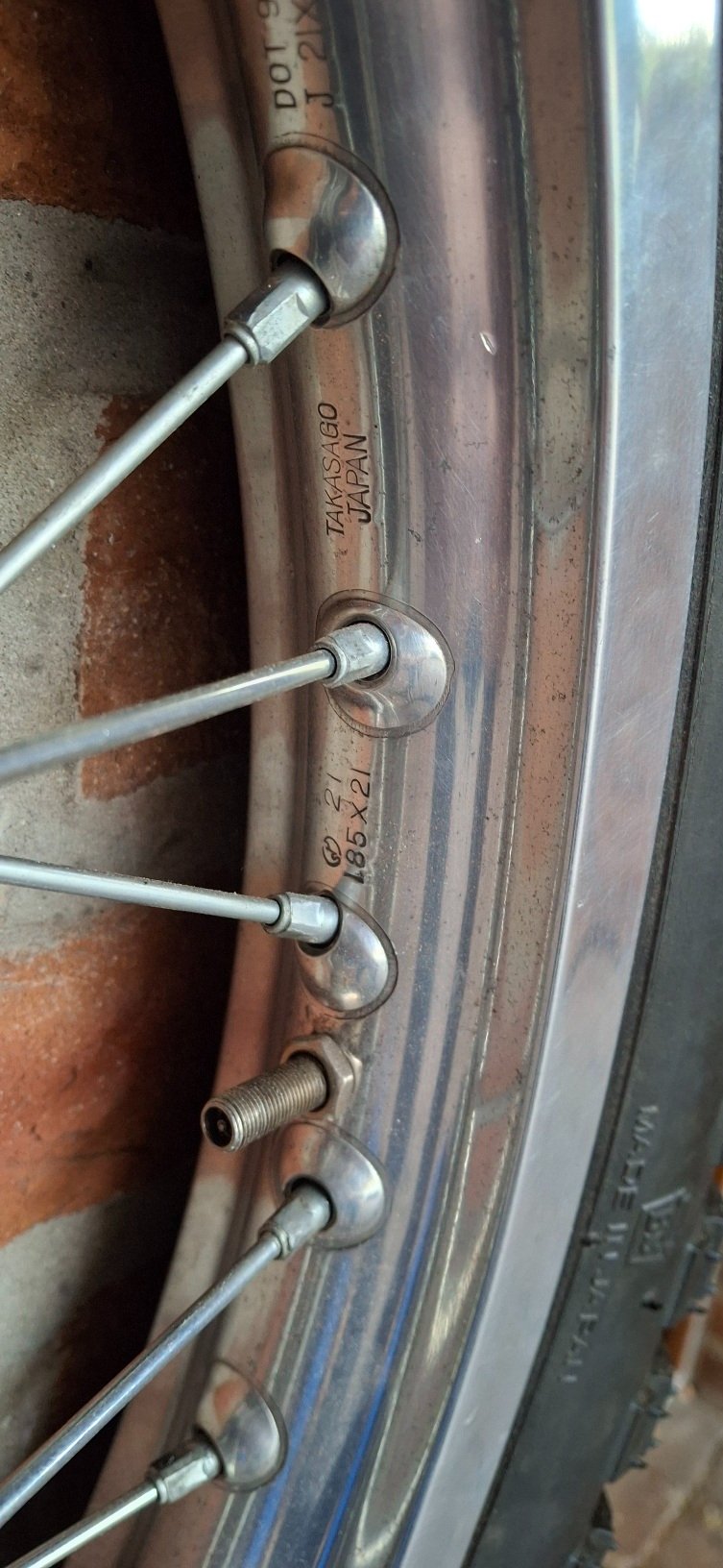 ich stelle also den Felgenring hochkant in Laufrichtung vor mich hin und stelle mir vor, ich sitze auf dem Motorrad (brumm brumm). Dann schaue von oben oben auf die nackte Felge und sehe einen eingeprägten Schriftzug.