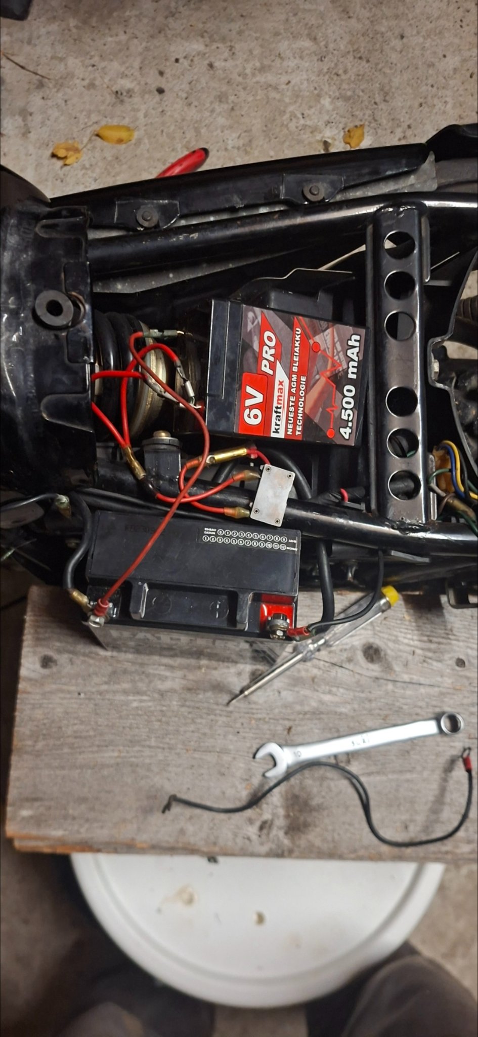 Oder du baust auf SR250 Lima mit Regler um - der Starter ist ja sehr wahrscheinlich von einer SR250. Für eine dickere Batterie hast du aber serienmäßig trotzdem keinen Platz.