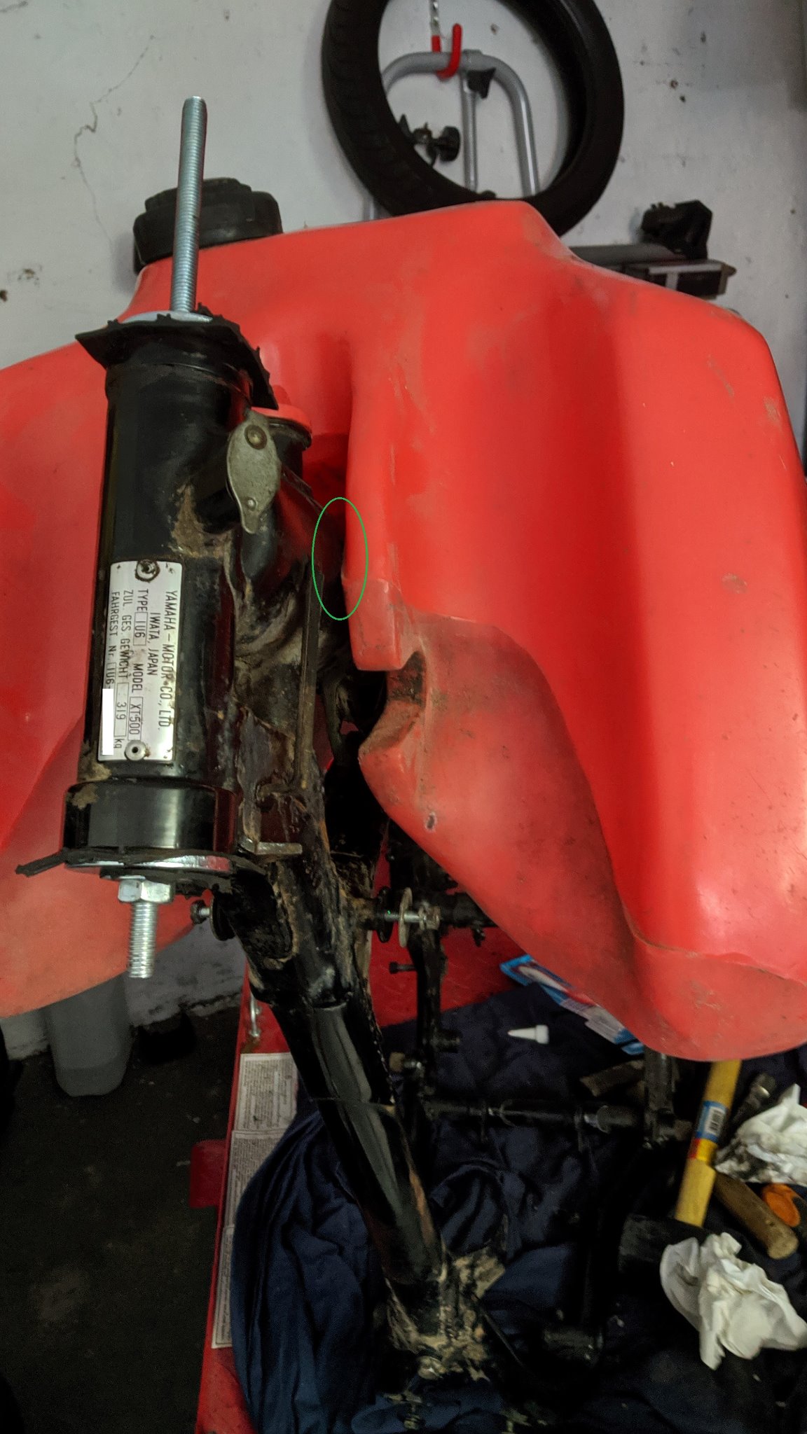Sagen wir mal so, man kann den Tank auf den XT-Rahmen anpassen. Etwas mehr als ein paar Hammerschläge sind allerdings schon nötig, weil der Rahmenöltank dafür doch deutlich zu dick ist. Die vorderen Tankbefestigungen müssen auch selbstgebaut und angeschweißt werden, die hintere kann man fast so übernehmen. Wenn da nicht die 5 Liter Restinhalt ohne Reserve wären, wär's ein schlanker Tourentank