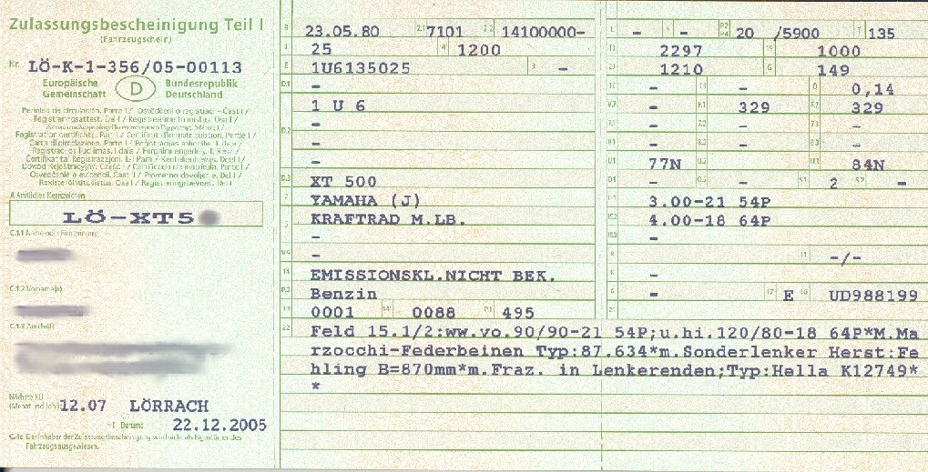 Wie ist es übrigens mit den neuen Fahrzeugpapieren. Gibt es hier schon jemanden, der eine"Zulassungsbscheinigung Teil I" für seine XT hat? Das Dokument hiess früher FZ-Schein. Der FZ-Brief heisst heute "Zulassungsbescheinigung Teil II"