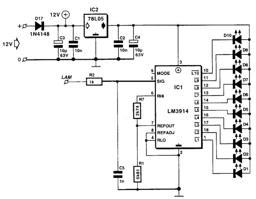 Das Signal der Lambda-Sonde wird über R2 dem Signaleingang des LED-Reihen-Treiber Ics LM 3914 zugeführt, wobei R2 und C5 als Tiefpass dienen und Störspitzen auf der Signalleitung unterdrücken. Die Referenzspannung des LM 3914 sind durch R1 und R7 so gelegt, daß das Spannungsfenster der Lambda-Sonde von 0 V (LED 1) bis 1 V (LED 10) in 0,1 V- Schritten abgedeckt wird. Der Mode-Pin ist offen, daher arbeitet der LM 3914 im Punkt-Modus.