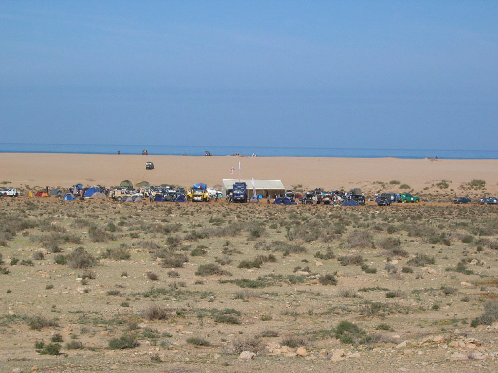 Es ist unser Ruhetag. In diesem Fall nur 290km Liaison. Frühstück ab 8.30 Uhr und Briefing um 9.00 Uhr fällt aus, da es nichts zu sagen gibt. Nach dem Frühstück dürfen wir in den Dünen und am Strand spielen und der Fotograf möchte gerne Team-Fotos machen. Gegen 11.00 Uhr bekommen wir von Auriol ein Roadbook für heute und morgen und fahren ab. Ich fahre die XT für 125km und suche ein Plätzchen für eine Rast. Wir finden eine Straße und ein Fischerdorf. Ein Fischer öffnet uns die Barriere und lässt uns an den Strand fahren. Unten finden wir ein Geisterfischerdorf vor mit einem menschenleeren Strand. Marco badet und wir duschen. Danach gibt es Pfannkuchen unter dem Sonnensegel. Super, besser könnte es uns nicht gehen. Irgendwann nach drei Uhr brechen wir auf und bedanken uns bei dem Fischer mit Resten aus unserern Lunchpaketen. Er fragt nach Whisky, doch wir haben ja keinen.