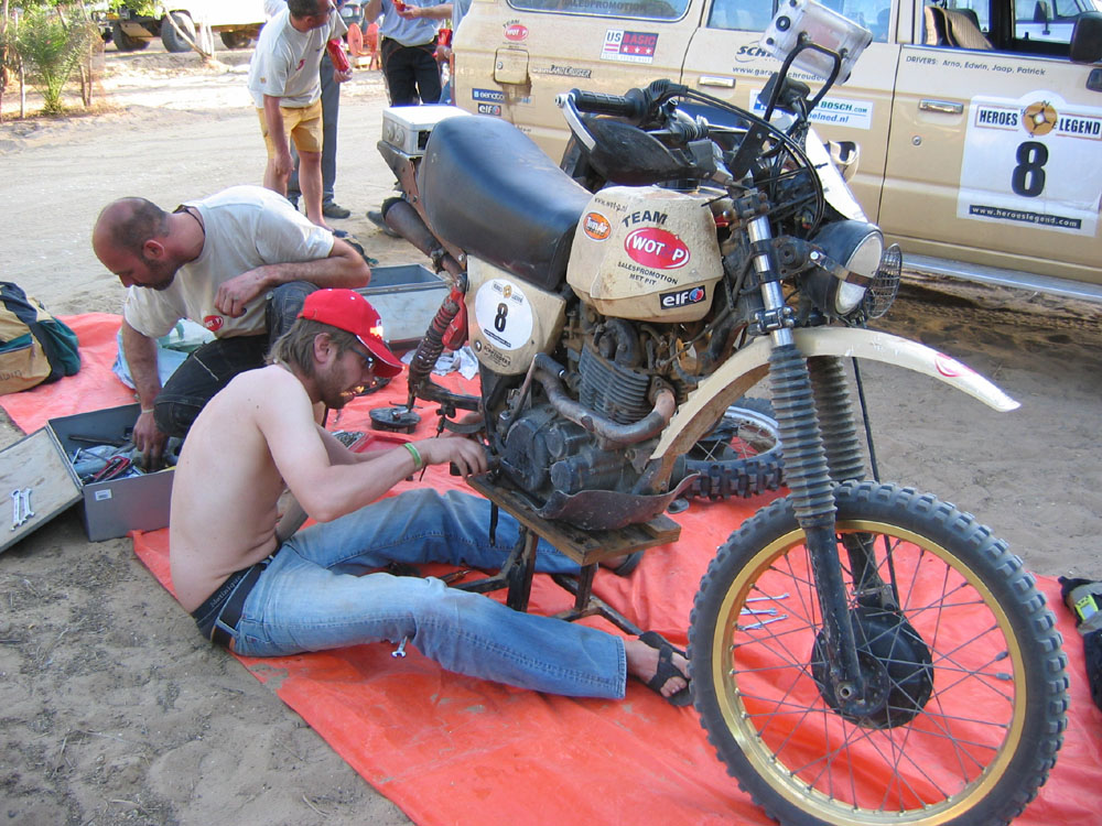Nach der Brücke über einen Fluß dann die Einreise nach Senegal, die genau so gut verläuft. Lutz ist schon durch und als Marco und ich die Pässe haben fahren auch wir ins Camp in Bango. Es ist sehr nett hier mit Pool und Toiletten. Viele Teilnehmer haben sich Zimmer genommen, wir bleiben aber beim Campen. Ich helfe dem WOT&P Team beim Richten der Bremse und Bart Franssen beim Einstellen der Zündung. 20.00 Uhr Briefing für den nächsten Tag. 80min für 80km Sand am Strand und in den Dünen. Start ist erst um 13.30 Uhr, wir haben genug Zeit für die 204km Liaison.