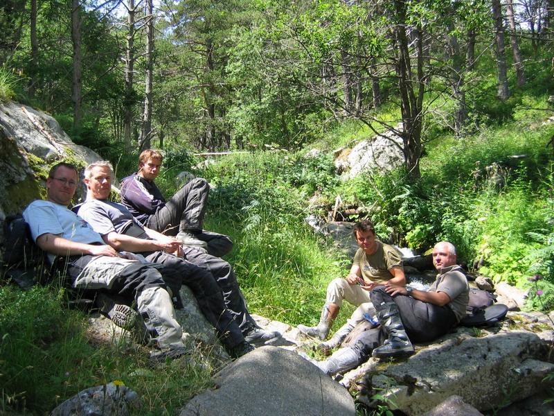 Um 9.30 Uhr treffen wir uns mit den Ösis in La Giandola auf der Tankstelle und tanken. Ziel ist das Fort de Marth und so fahren wir ein Stück zurück nach Sospel und biegen in einer Kurve ab in das Vallee la Maglia. Die Strecke ist zunächst geteert, später geschottert, aber sie ist immer schmal und sehr schön. Entgegenkommende Fahrzeuge sind hier ein Problem. Bei der Ortschaft la Maglia überquert man den im Tal verlaufenden Bach und fährt wieder bergauf. Kurz nach dem Wanderwegweiser 172 machen wir einen Stopp. HorXT erzählt, dass das Fort de Marth schon aus dem Mittelalter ist, und dass nur noch wenige Mauerreste übrig sind. Wir sehen von einem Besuch ab, da man erst um einen kleinen Berg herumwandern hätte müssen. Weiter geht es die Piste berauf. An der nächsten Abzweigung biegen wir links ab und kommen so auf kürzestem Wege zu einer großen Schotterpistenkreuzung Baisse de Colla Basse. Wir wählen diagonal gegenüber die Piste Richtung la Castagna. Auf dem Weg hinab müssen wir uns nur einmal rechts halten, sonst ist der Weg einfach zu finden und einfach zu fahren. Bei la Castagna treffen wir auf eine einspurige Teestraße und biegen nach rechts auf sie ein. Sie führt durch ein schönes Tal, aus dem wir noch vor dem Ort Maurion nach links auf eine weitere Piste abbiegen. Nach einer Weile windet sich die Strecke in Serpentinen den Berg hinauf und wir haben einen schönen Ausblick. Bis auf etwa 1200m windet sich die Piste, bevor sie langsam wieder ins nächste Tal abfällt. Am westlichsten Punkt der Piste überquert sie einen kleinen Bach. Die Stelle schreit nach einer Pause und so picknicken wir am Bach im Schatten der Bäume. Erst nach weiteren 9km verwandelt sich die Piste bei dem Ort Bergue Inferieur in eine einspurige Teerstraße, welche sich wieder in unzähligen Serpentinen ins Tal der Roya windet. Etwas nördlich von Fontan treffen wir auf die Hauptstraße und fahren nach Saorge, wo wir ein Café heimsuchen. Saorge ist ein malerisches Bergdorf, welches von Norden und von Süden anzufahren ist, man kann aber nicht hindurchfahren. Zu eng und verwinkelt sind die Gassen und Sträßchen.