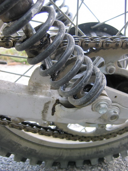 In einer der vielen Serpentinen rutscht mir ganz langsam das Vorderrad weg und ich knalle nach rechts auf den Asfalt. Was war das denn? Ölspur in Zeitlupe? Ich habe sogar genug Zeit meine Hand auszustrecken, um mich abzustützen. Blinker im Eimer und Hebel abgebrochen. Wir suchen die Ursache für meinen Fall und stellen fest, dass alle Außenstollen meines Crossreifens angebrochen sind. Oha! Na ja, nach kurzem Stopp geht es weiter nach Delmonte. Für einen Kaffee ist diesmal keine Zeit, da wir mit den Ösis in Tende Pizza essen wollen. Im letzen Ort vor den Tunnel rufen wir HorXT an und checken die Zeit. Sie sind noch weiter im Norden und so können wir auf einer Tanke etwas trinken und uns mit einem Italiener unterhalten, der auch noch eine XT hat und sich unsere Gabeln genau ansieht. Natürlich laden wir ihn 2010 nach Sospel ein. Da wir ja noch soviel Zeit haben, beschließen wir über den Pass nach Tende zu fahren. Diese Seite kennen wir ja noch nicht. Der Anstieg beginnt direkt rechts vor dem Tunnel und führt durch ein kleinen Skigebiet. Bis fast ganz oben ist er geteert. Auf dem Col de Tende halten wir nicht mal an und fahren sofort auf der anderen Seite wieder hinunter. Irgendetwas rattert bei mir im Antrieb. Hört sich an wie ein Stein, der an der Kette scheuert. Ich halte an und schaue kurz nach. Nichts zu sehen. Weiter, aber das Geräusch ist noch da. Komisch. Als die Strecke vom Schotter zu Teer wird, mache ich den Motor aus und lasse mich rollen. Das Geratter ist deutlich zu hören. Ich steige nochmal ab und kann jetzt das Problem ausmachen. Ich rolle weiter zu Claus und Schmiddo und rufe ihnen schon von weitem zu, dass ich auch ein paar Wilbers nehme. Die Druckstange meines Bilstein-Dämpfers auf der linken Seiten hat sich aus dem Auge herausgedreht und die Feder ist gegen die Kette ausgebeult. Leider ist da auch Öl zu sehen. Schade. Glücklicherweise ist der Aluring noch da, so dass wir die Druckstange wieder einschrauben können und mithilfe einer Rohrzange die Feder auf den Federteller hebeln. Weiter geht es und so sind wir nur eine halbe Stunde zu spät in Tende. Die Ösis kommen sogar noch 10 Min. später an. Prima, auf in die Pizzeria.