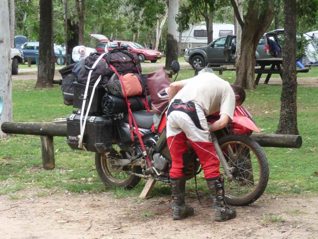 Ein schwedisches Pärchen das kurz vorher ein Paket mit Winterklamotten heimgeschickt hatte ... der Wasserkanister war unten hinter dem Hinterrad angebracht in einem Rohrgestell das bei jeder Bodenwelle Funken schlug ... da drunter ist irgendwo eine alte 600er Transalp der ersten Serie.