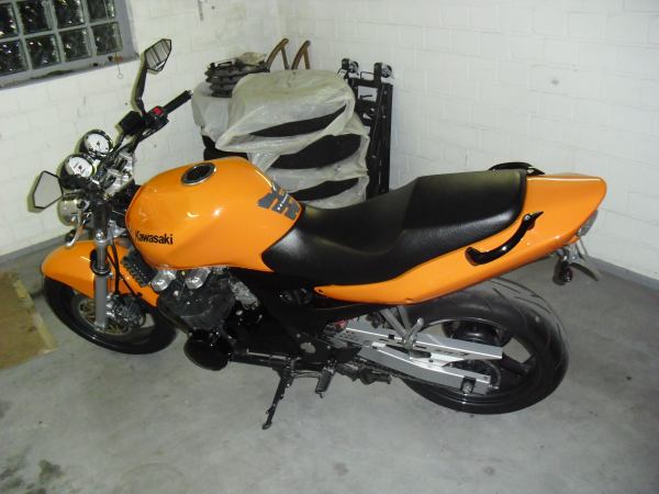 Da habe ich als zweites noch meine Kawasaki Zr. 7 Bj. 2000 Gemacht wurde, wie man sieht, umlackiert auf das Orange des Focus RS. Lampenmaske, Höherlegung, Blinker, Bremslicht. Scharfe Nockenwellen der GPZ 750 verbaut, K&N Filter... ist ein verdammt aggressiver Kurvenräuber geworden. Fällt förmlich in die Kurven und man kann sich auf Kurvigen Landstraßen sehr gut mit Supersportlern "prügeln" also, bis zur nächsten Geraden.....sie soll aber bald einer 1100 GPZ mit ABS weichen.